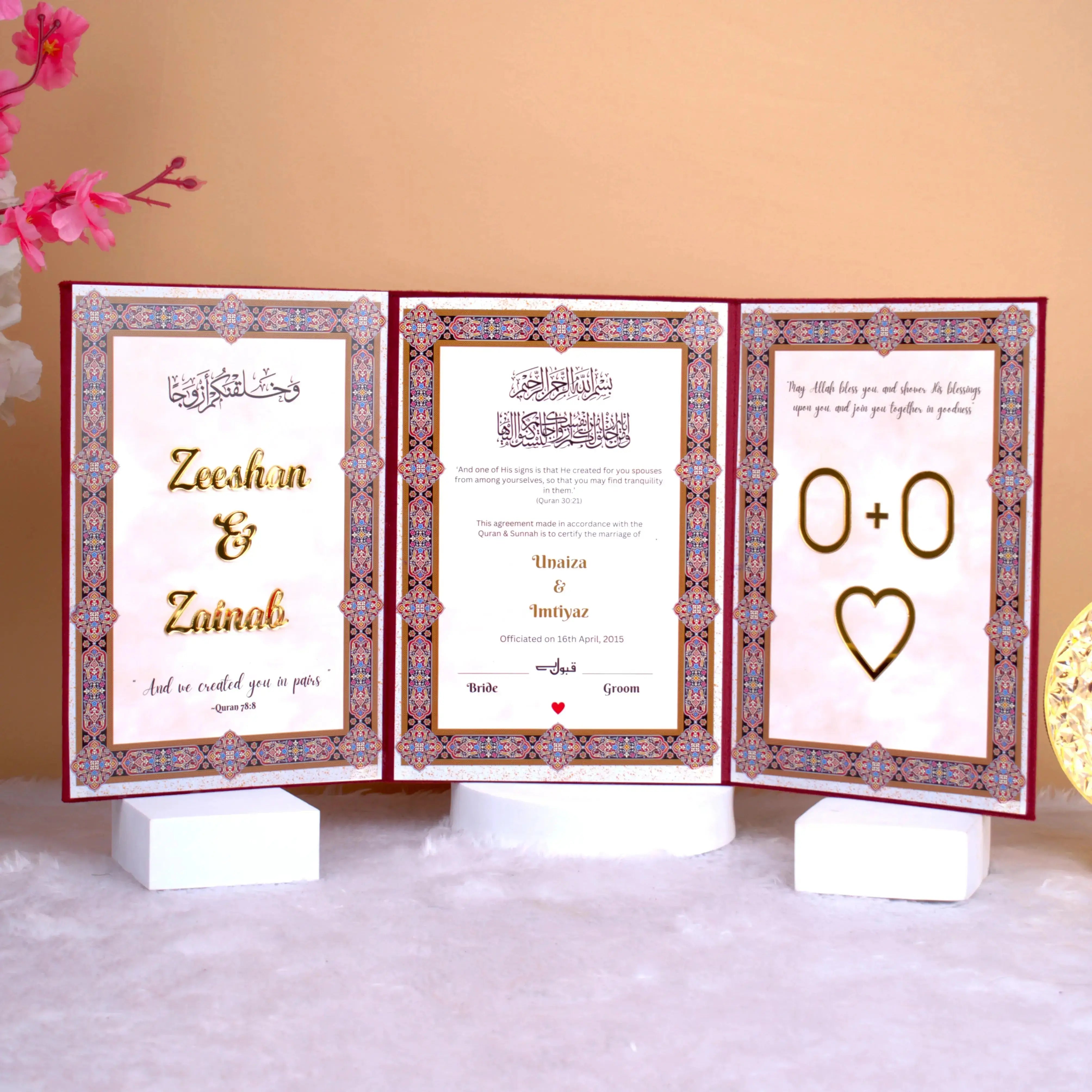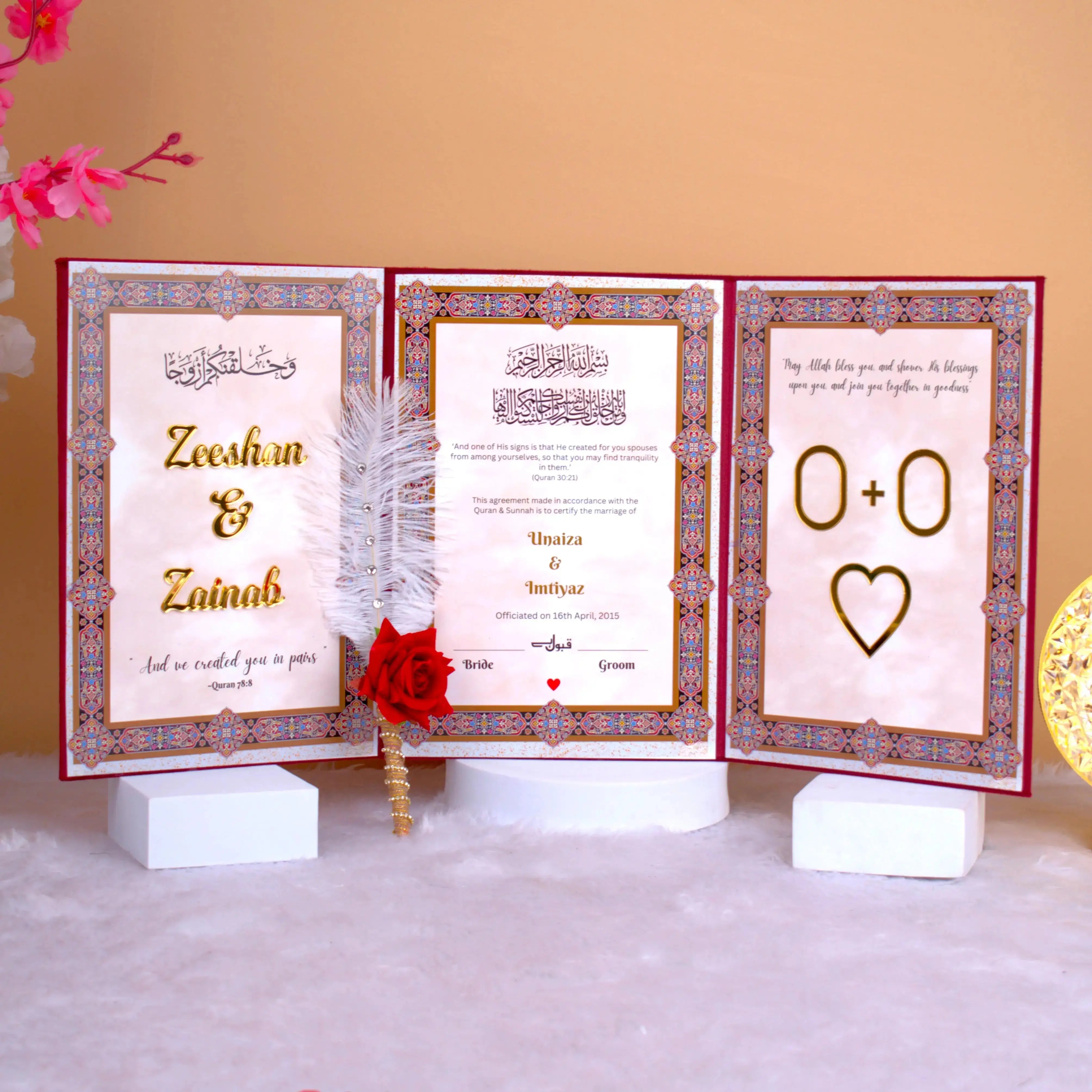 Commemorate the sacred union of marriage with the Eternal Petals Nikah Nama A3 Size, an elegant and meaningful keepsake designed to honor Islamic traditions. Featuring a unique thumbprint section for the bride and groom, this customizable Nikah Nama is a timeless reminder of their vows and love. Includes the couple’s names, wedding date, making it uniquely theirs.