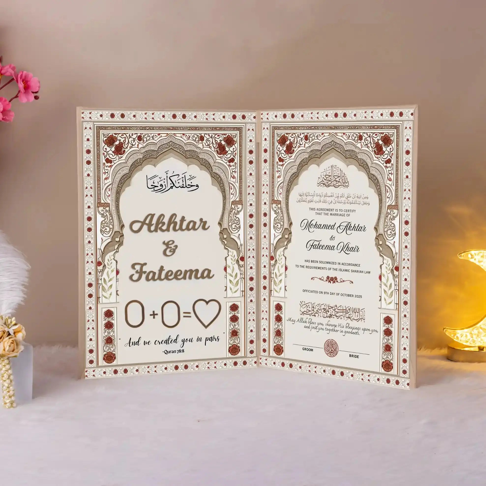 Ideal as an Islamic wedding gift, it carries a regal aura and makes a memorable addition to any Nikah ceremony. The ornate patterns draw from Islamic architecture, echoing heritage and timeless artistry. Whether displayed at home or preserved in its elegant form, this design ensures the memory of Nikah remains beautifully captured.