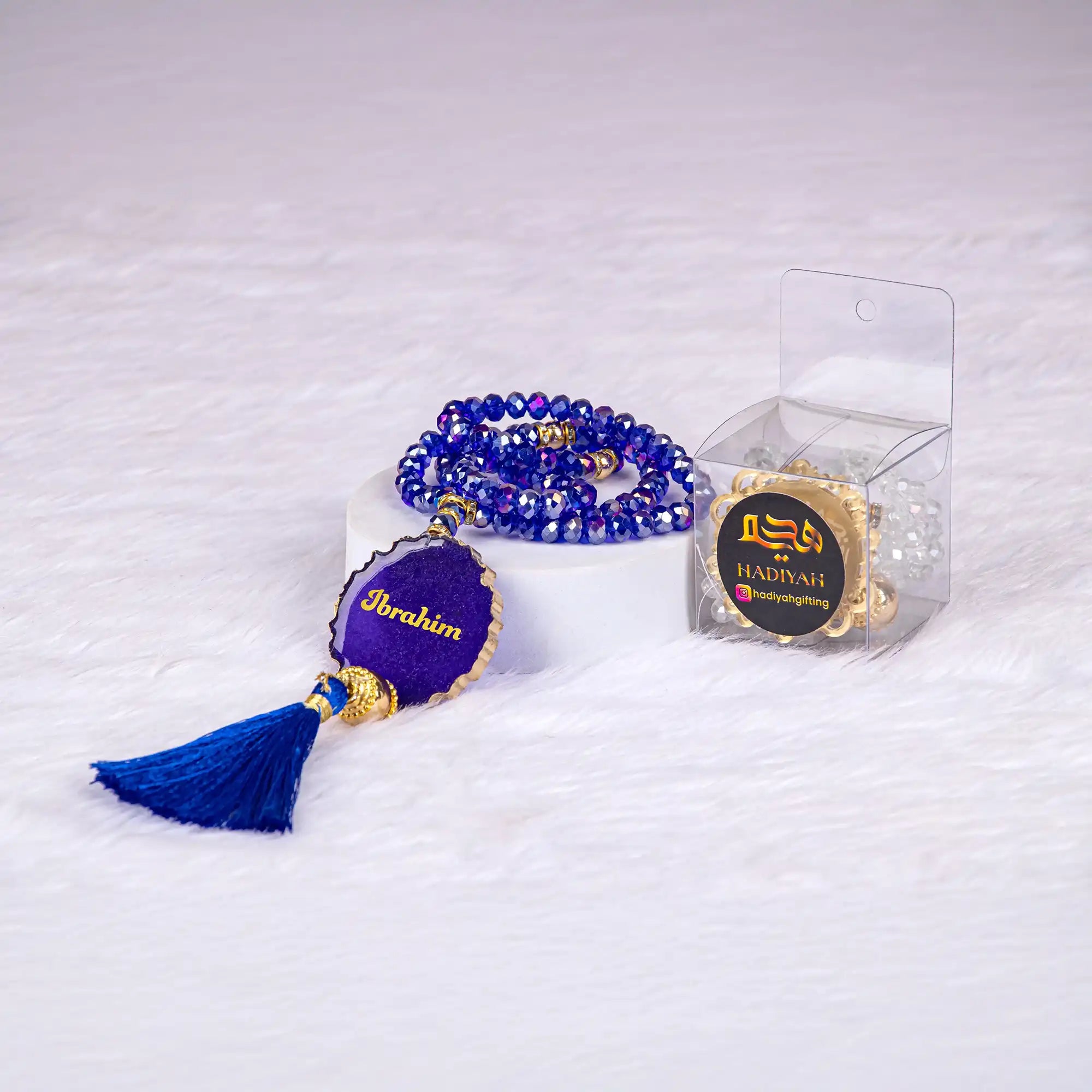 Elevate your spiritual journey with the elegance of this 100 Beads Crystal Tasbeeh, a perfect choice for Islamic gifting. Each bead shimmers with clarity and purity, symbolizing a heartfelt connection to the divine. The tasbeeh is beautifully adorned with handmade resin agate personalised with your name intricately inscribed.