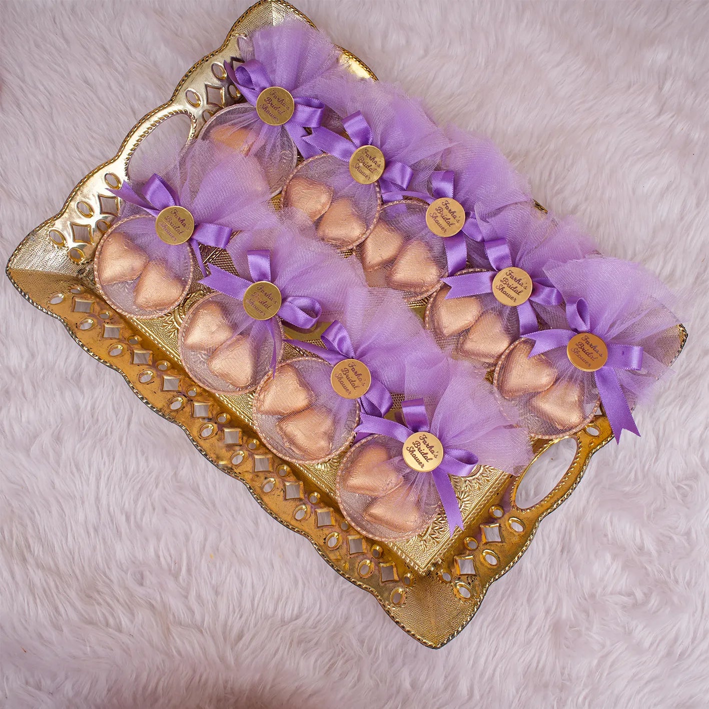 A charming bridal shower favour featuring two gold-wrapped heart chocolates presented in a delicate mesh pouch. Finished with a soft purple bow and a personalised gold tag, this sweet keepsake adds a touch of elegance and warmth to your celebration.