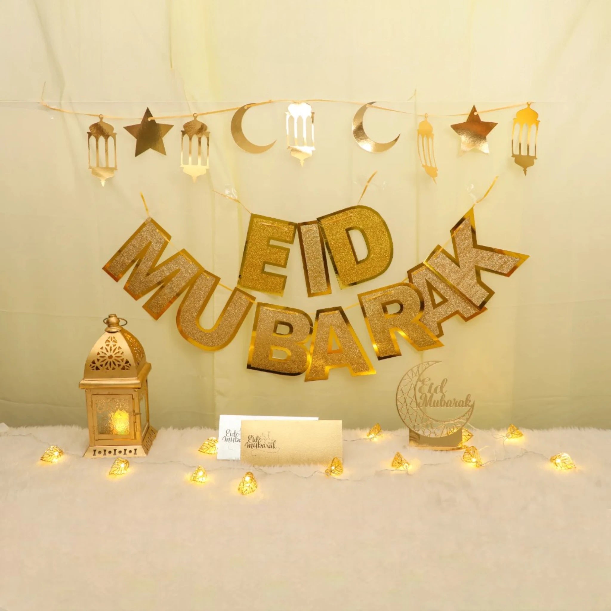Transform your home into a festive wonderland with the Eid Grand Celebration Decor Set! This complete decor combo includes a statement big lantern, an elegant Eid Mubarak stand, banners, twinkling golden lights, and 10 colorful Eidi envelopes for kids, making it perfect for a joyous celebration.