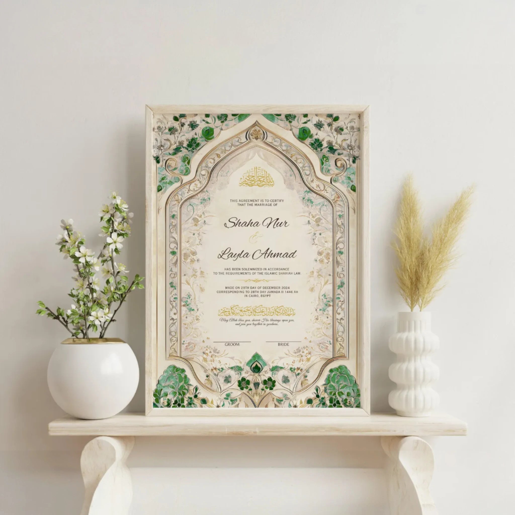 The Nikah Nama features timeless Islamic motifs and an artistic calligraphic layout, ensuring it becomes a cherished home décor piece. Encased in a high-quality wooden frame with a smooth finish, offering durability and sophistication. Customizable with the couple's details to make it truly unique and heartfelt.