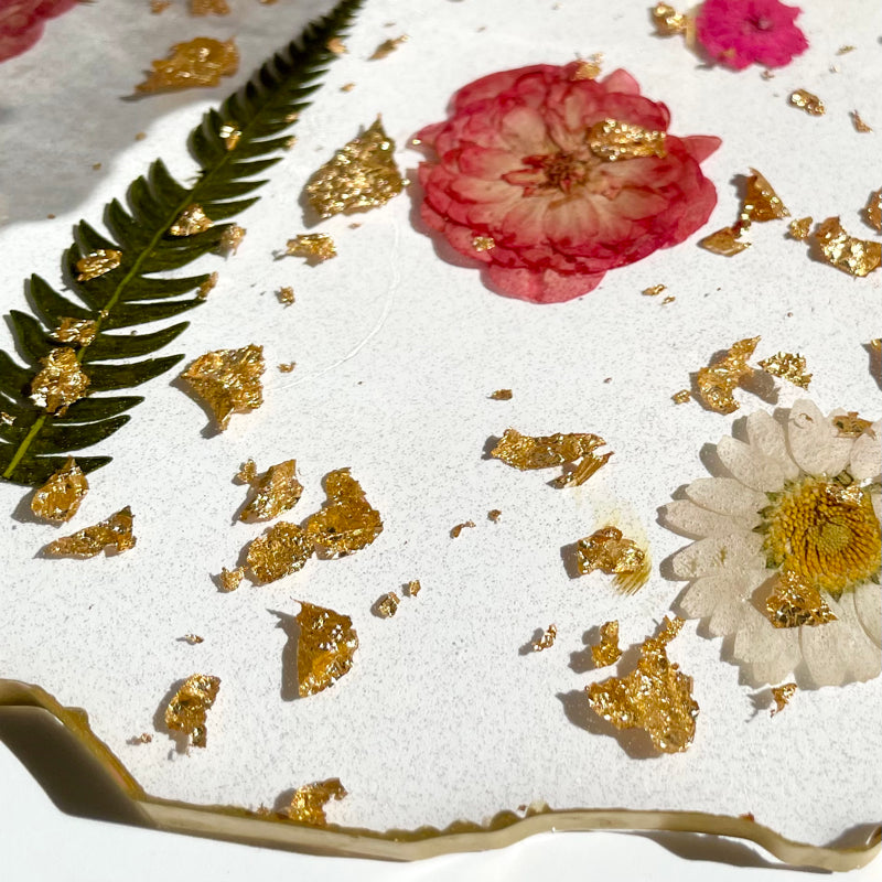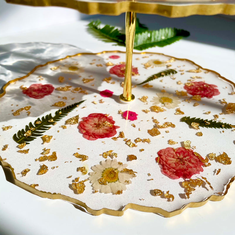 A unique, handcrafted 3-tier stand, perfect for elegantly serving sweets, pastries and even for displaying jewelry. This exquisite piece is crafted using real pressed flowers, making it truly one of a kind.
