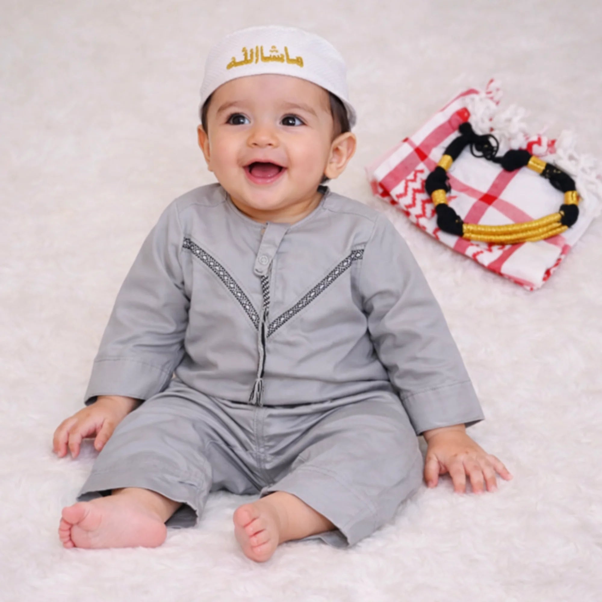 Celebrate the joy of Ramadan with this adorable baby boy Romper and Ghutra set, a perfect choice for EID for the little ones. Made from ultra-soft, breathable fabric, this imported material romper ensures all-day comfort for your baby. Designed with charming Omani Style prints. The snap-button closure allows for easy dressing and diaper changes, making it a practical yet thoughtful gift. Whether for a newborn or a toddler, this romper is a beautiful way to spread love and blessings during Ramadan