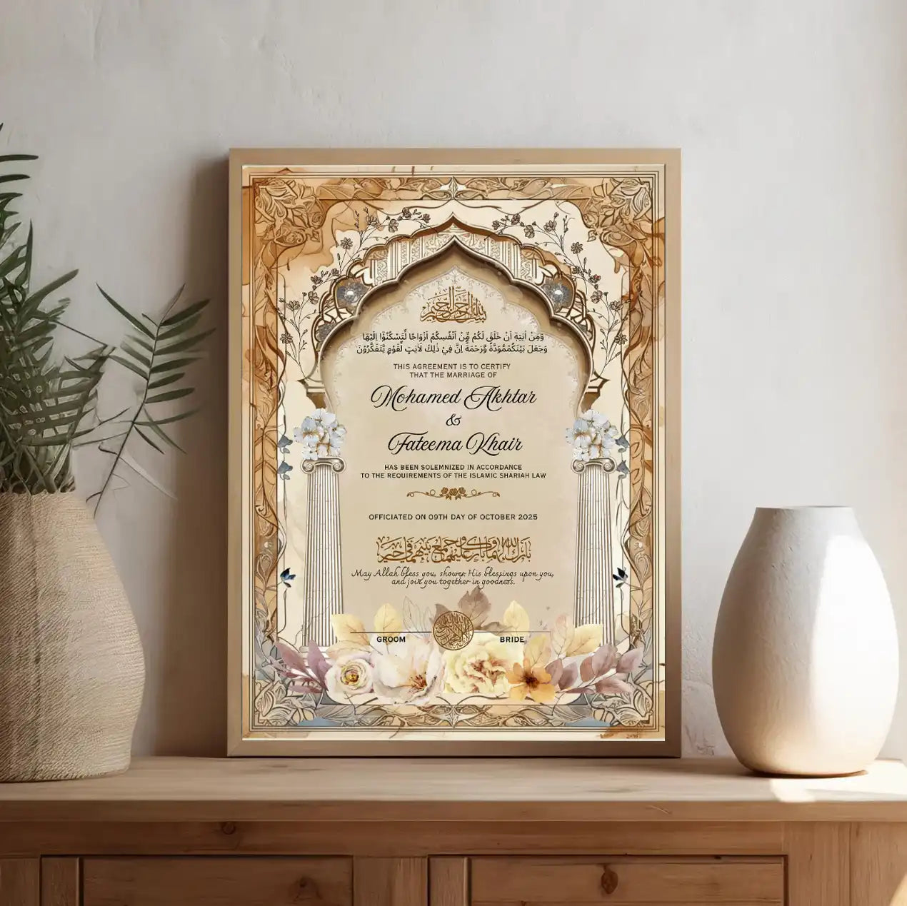 Gentle, graceful, and full of blessings — Gul-e-Rahmah is a Nikah Nama that celebrates compassion, love, and divine mercy. Designed in soothing pink and pastel tones, this exquisite frame reflects soft elegance, inspired by blooming flowers that symbolize growth, harmony, and devotion in marriage.