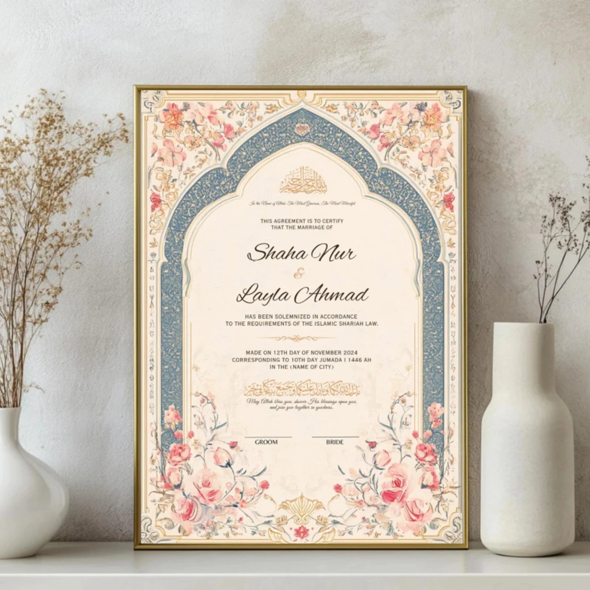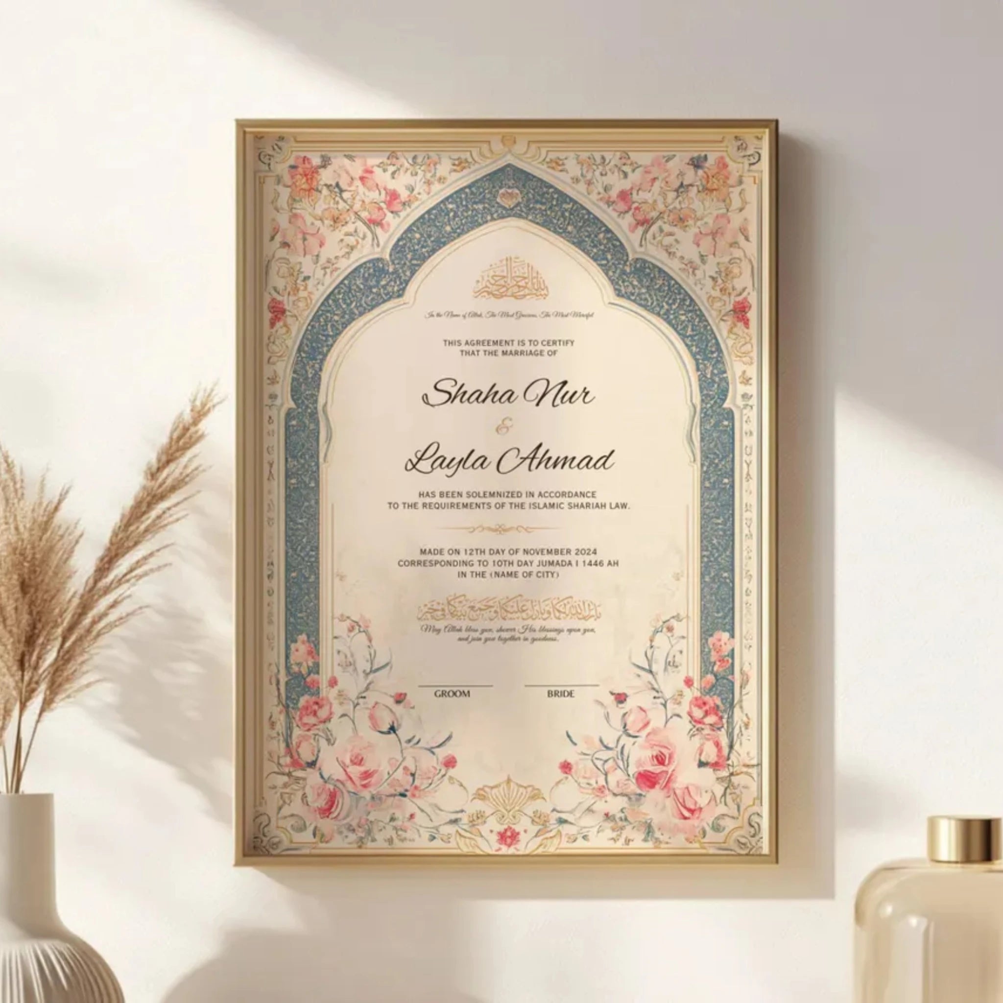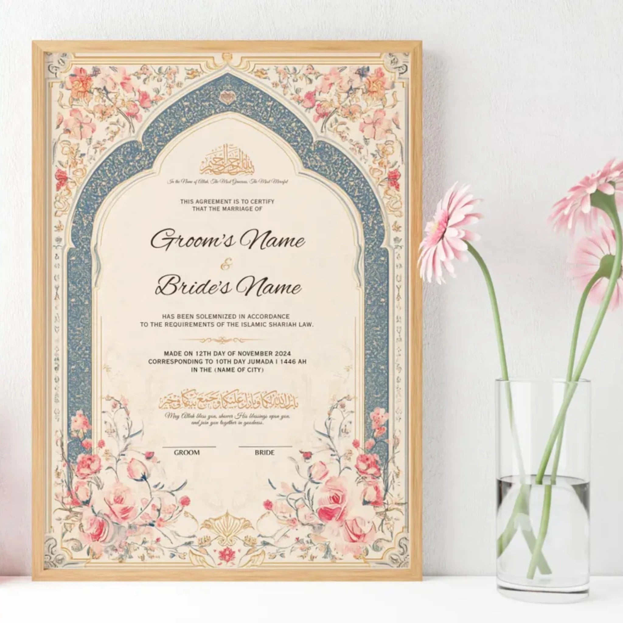 Celebrate the sacred bond of marriage with this beautifully crafted Nikah Nama Certificate encased in a premium wooden frame. A perfect Islamic wedding gift, this elegant keepsake symbolizes love, faith, and commitment.