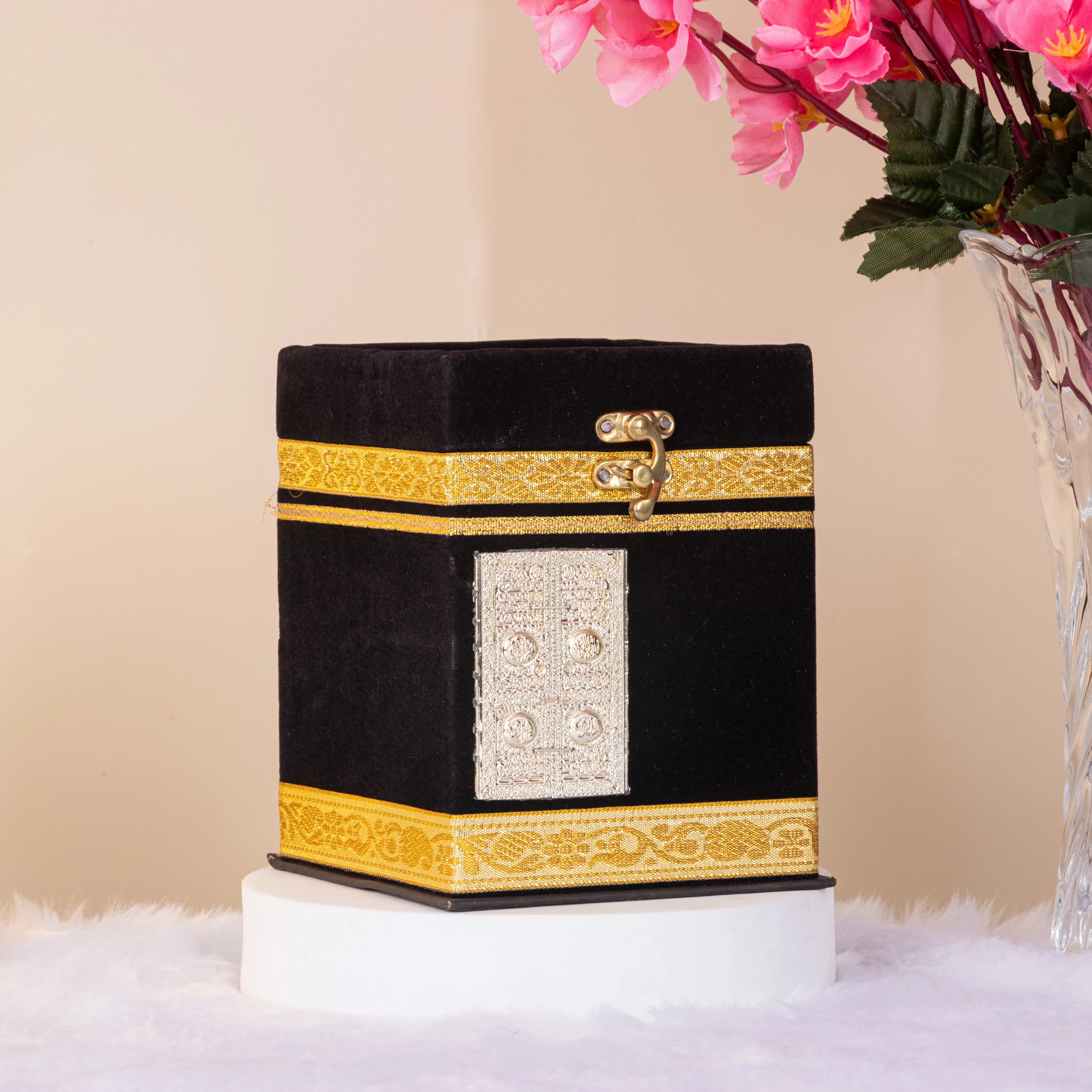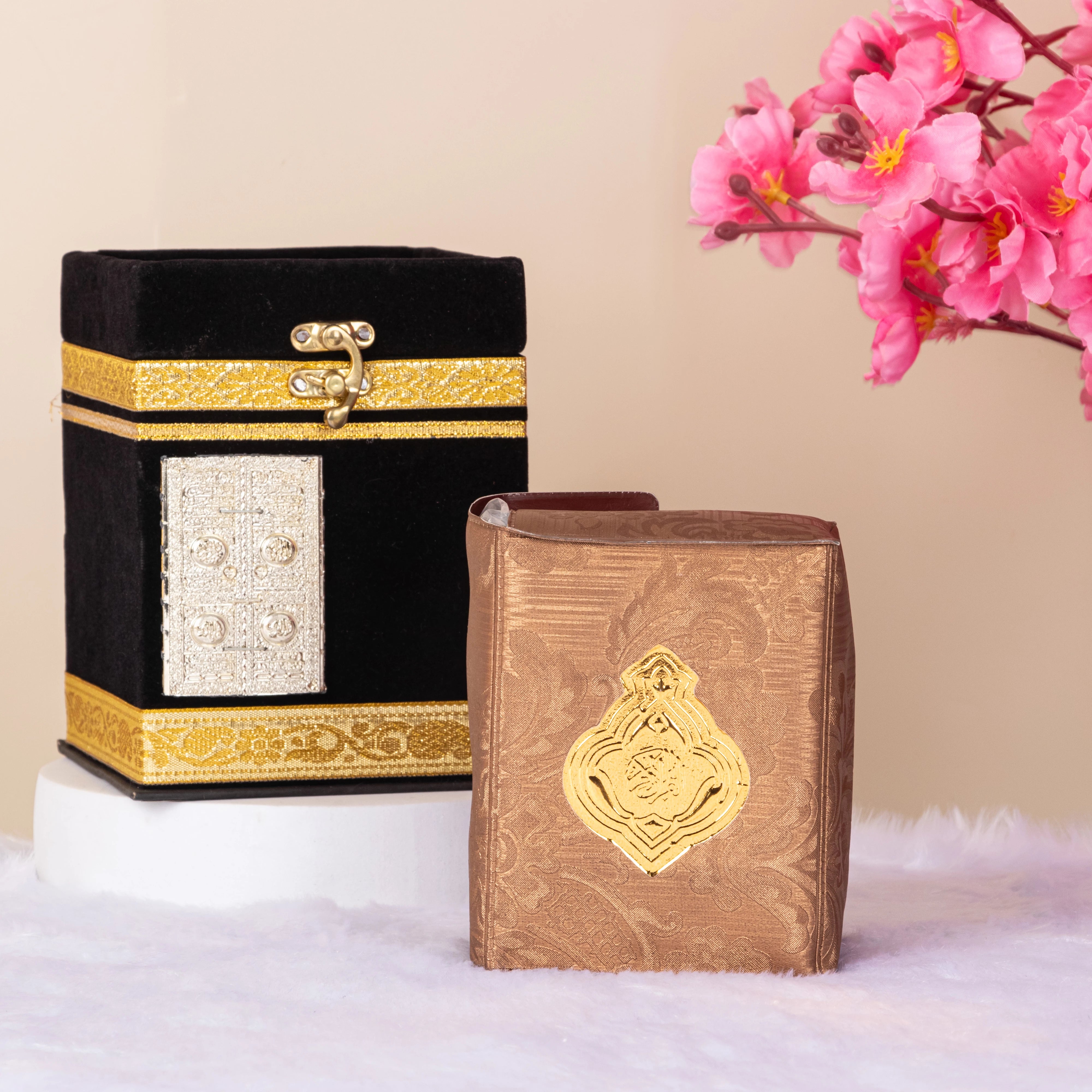 Introducing the Kaaba Box with 30 Para Quran, a beautifully crafted piece designed for Islamic gifting. This elegant box is a perfect blend of spiritual significance and luxurious craftsmanship, making it an ideal gift for loved ones. Inspired by the Kaaba, the black velvet exterior, adorned with intricate gold detailing, pays homage to the holiest site in Islam, symbolizing purity and devotion. Complete Quran, enclosed within is a complete 30 Para Arabic Quran, printed with precision and clarity for a fulfilling recitation experience.