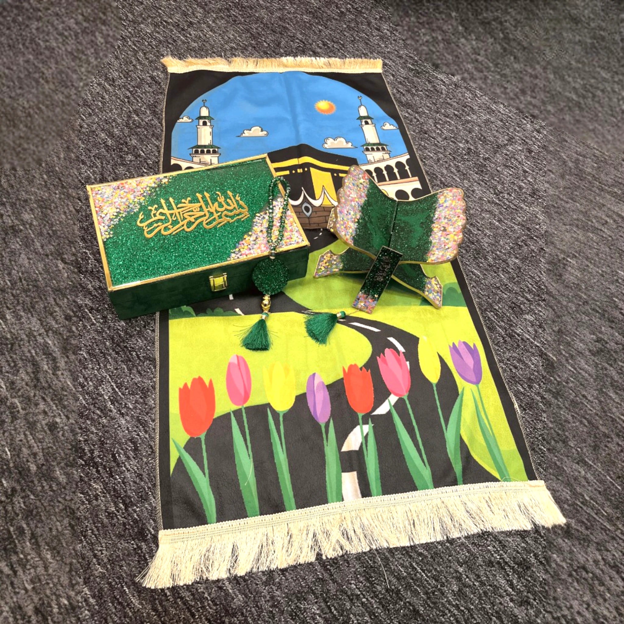 The Kids' Sawab-e-Jariya Hamper is a beautifully curated gift set designed to inspire young hearts towards faith and devotion. Thoughtfully crafted, this hamper includes a designer handmade resin box elegantly engraved with Bismillah, adding a touch of spirituality and elegance. It features a personalized tasbeeh, custom-made with the child’s name, encouraging them to develop a habit of remembrance. The set also includes a soft and comfortable janamaz, personalized with their name, making prayer time even more special. A Bismillah bookmark serves as a perfect companion for Quran reading, while a beautifully carved rehal provides a graceful stand for ease of recitation. Perfect for Ramadan, Eid, or any special occasion, this meaningful hamper is a timeless keepsake that nurtures love for faith in little ones.