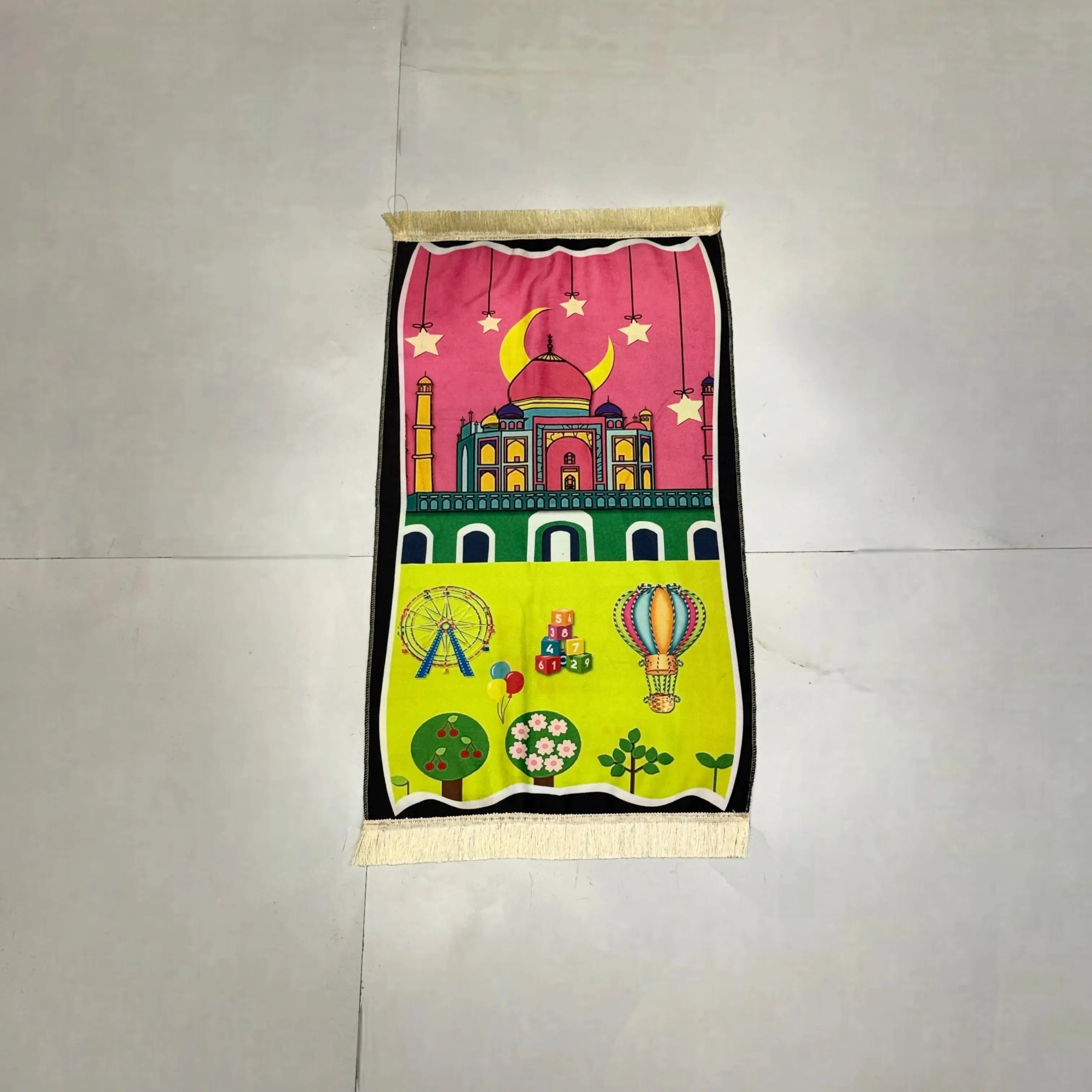This beautifully designed prayer mat features the Masjid, inspiring young hearts to connect with their faith. With soft padding and non-slip backing, it ensures a comfortable and safe prayer experience for kids.