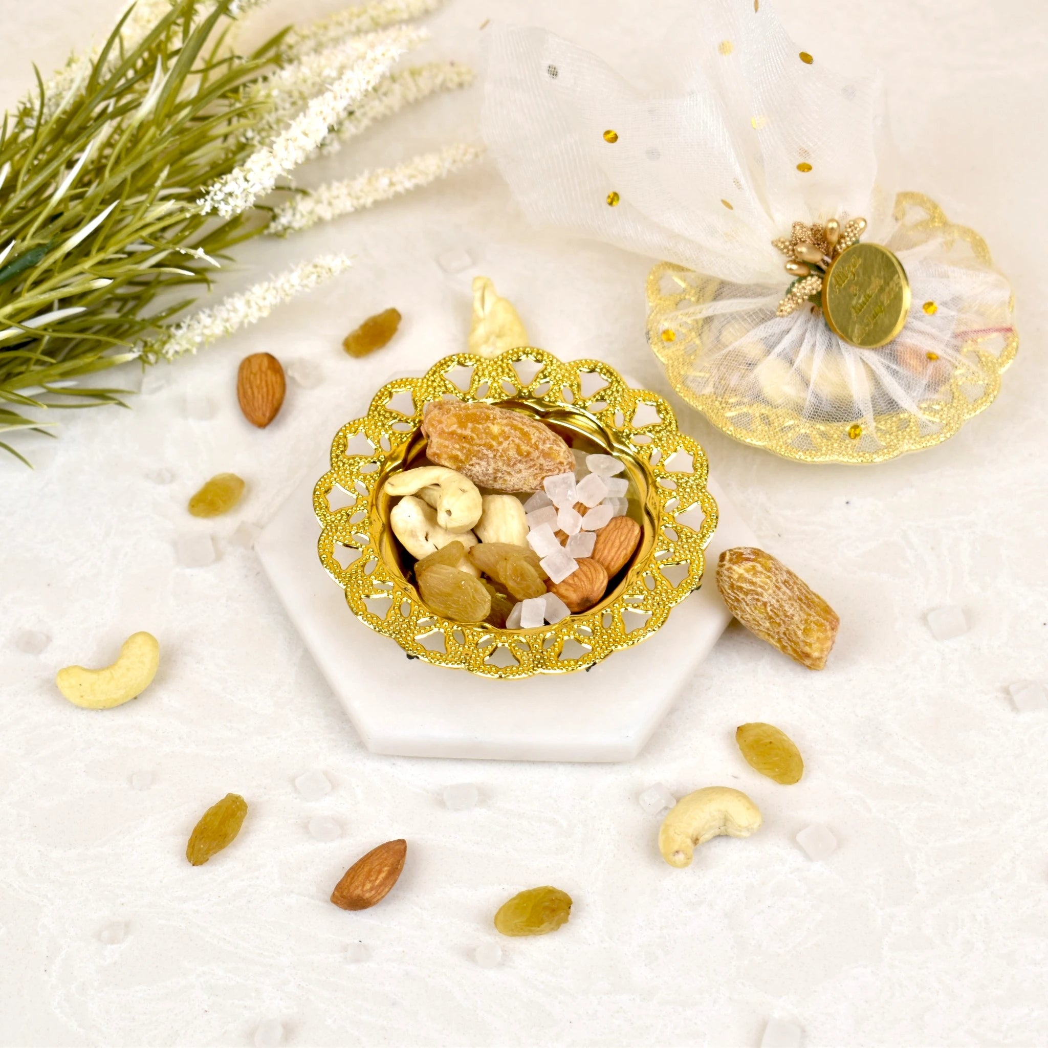 Celebrate the sacred bond of Nikah with our elegant Mix Dry-Fruit Nikah Favor Gift Tray—a perfect blend of tradition and luxury. In Islamic culture, dry fruits are often shared as symbols of prosperity, joy, and blessings, making this beautifully designed tray an ideal gift for your Nikah ceremony. Featuring an assortment of premium dry fruits arranged in a decorative tray, this thoughtful gift reflects the warmth and generosity of Islamic traditions, offering a meaningful gesture to your loved ones on your special day.