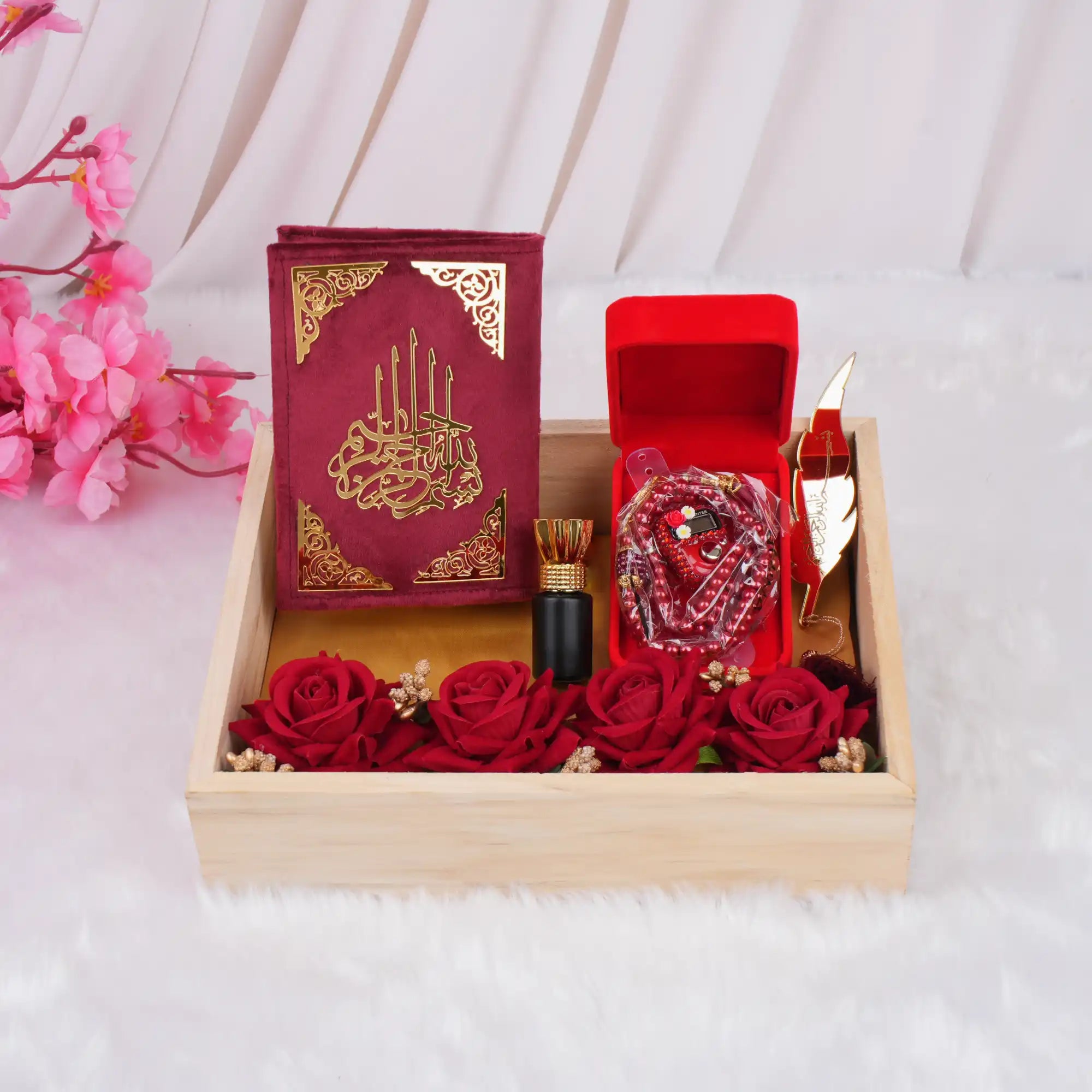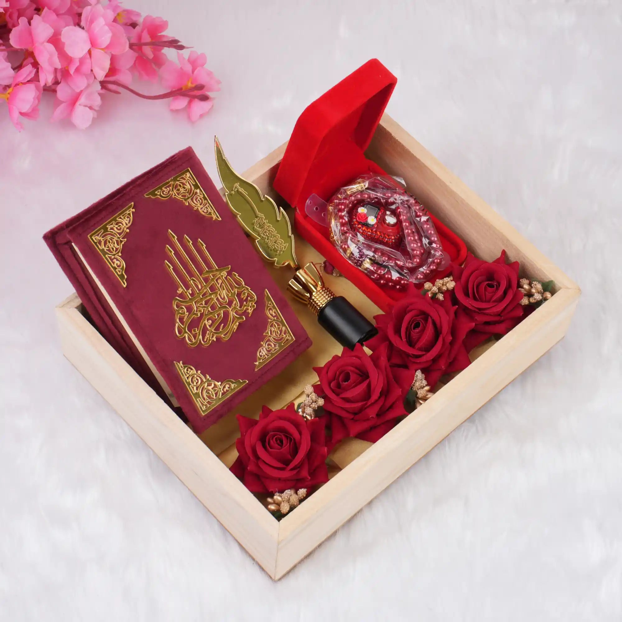 At the heart of the gift lies a Quran bound in an elegant velvet cover, offering both sophistication and reverence. The clear Arabic script and premium presentation make it perfect for daily recitation or as a cherished keepsake.