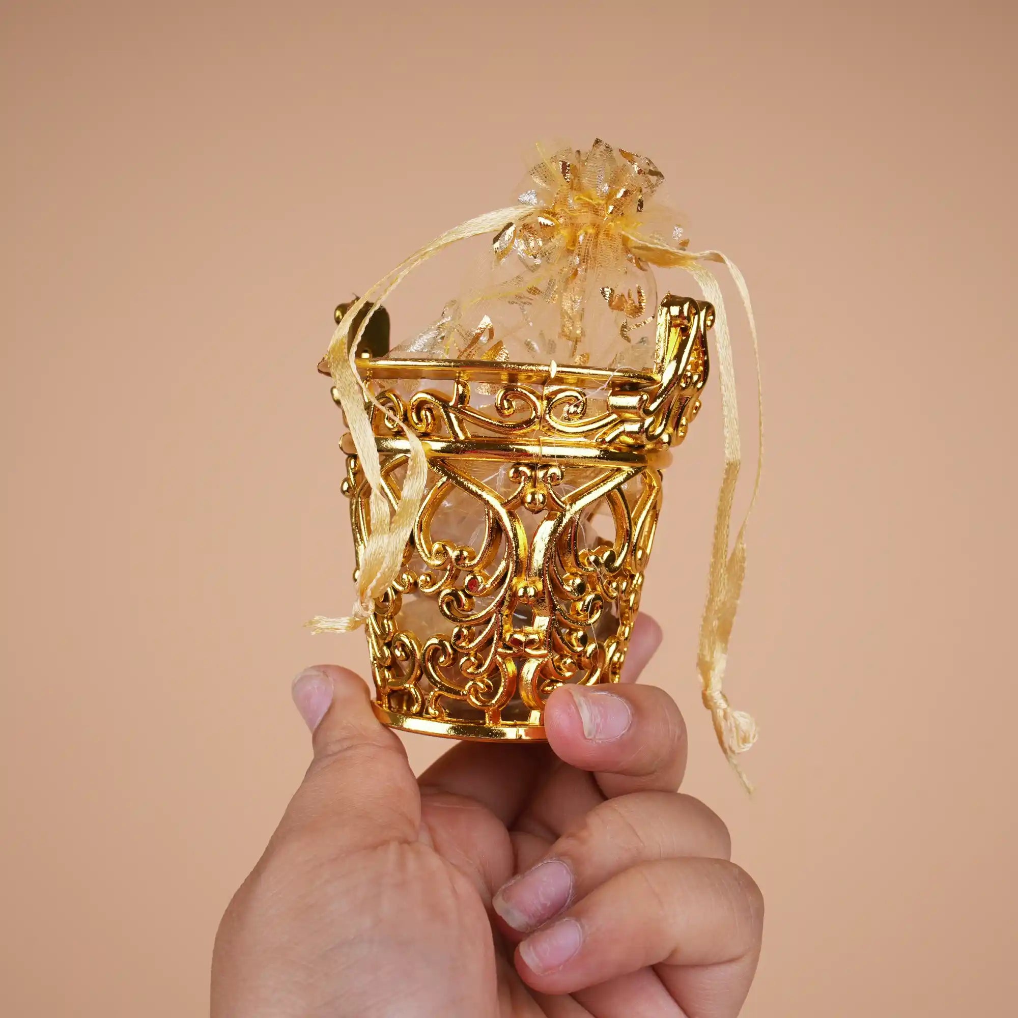 An elegant gold basket filled with premium dry fruits, beautifully wrapped in a sheer organza pouch. Perfect as a Nikah, Eid, or festive favour that blends luxury with thoughtfulness. The intricate metallic design adds a royal touch to every celebration. A wholesome treat that symbolizes sweetness, health, and gratitude. Beautifully presented to delight your guests and elevate your gifting.