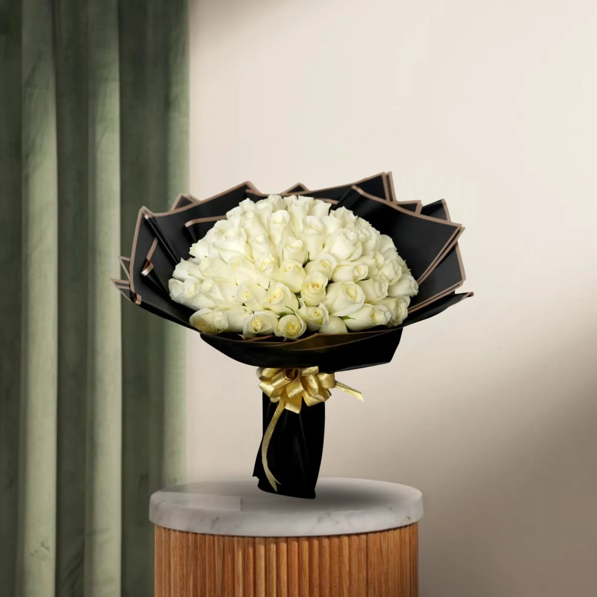 This serene bouquet of white roses speaks of purity and peace. It’s a beautiful gift for celebrations, condolences, or moments that require elegance and grace.