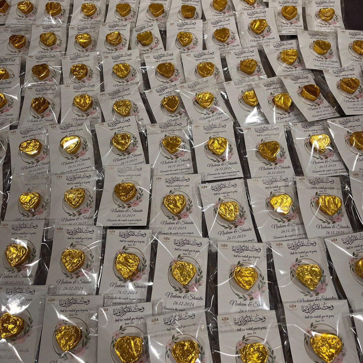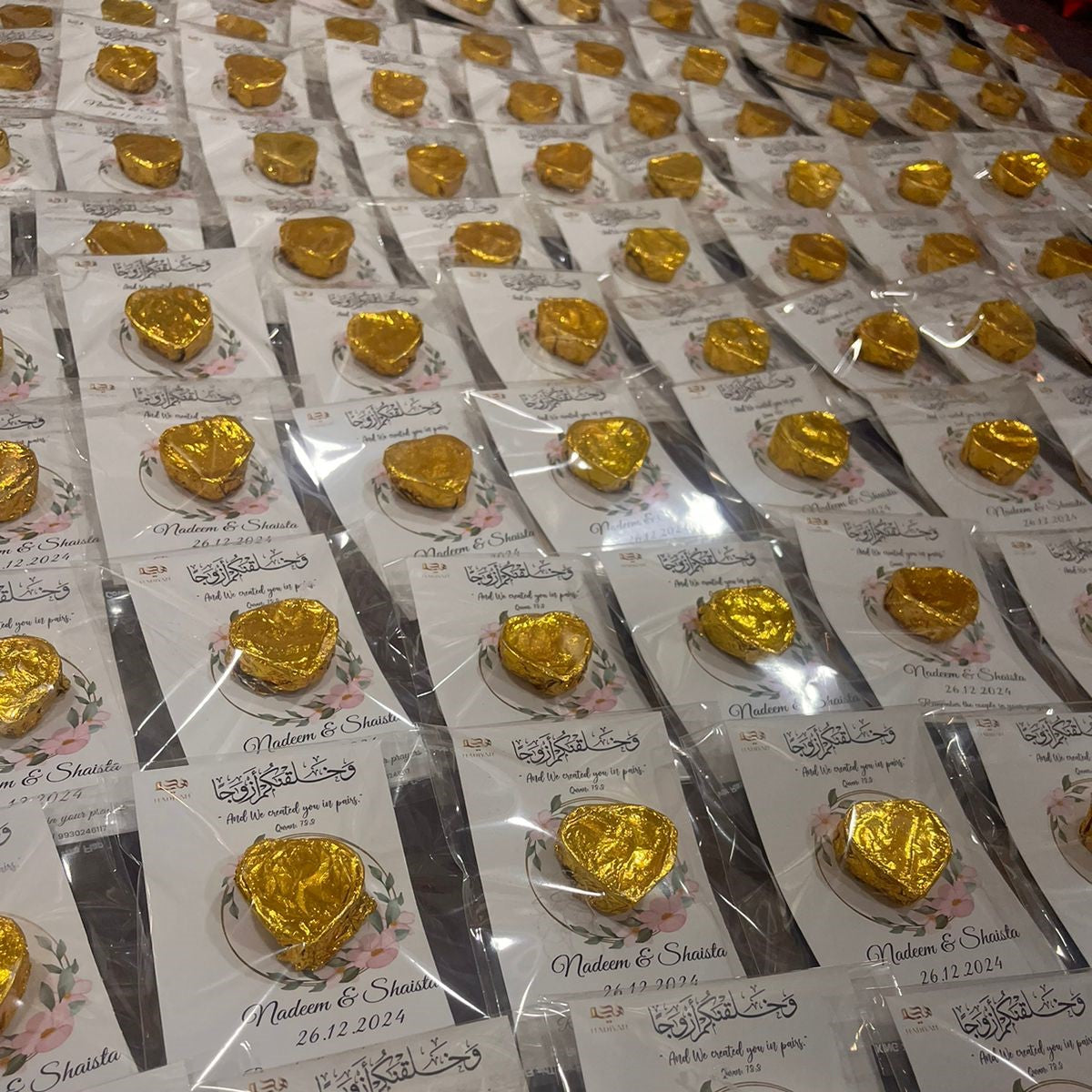 Our Customized Premium Chocolate Cards make the perfect gift for weddings, blending luxury and personal touch. These cards can be personalized with the groom and bride's names and wedding date, featuring elegant Islamic designs like crescent moons and Arabic calligraphy. Crafted from high-quality chocolate, each card offers a rich, indulgent experience. The elegant packaging can also be customized with a special message. Ideal for weddings, bridal showers, or Nikah celebrations, these chocolate cards provide a sweet, memorable memento of the special day.