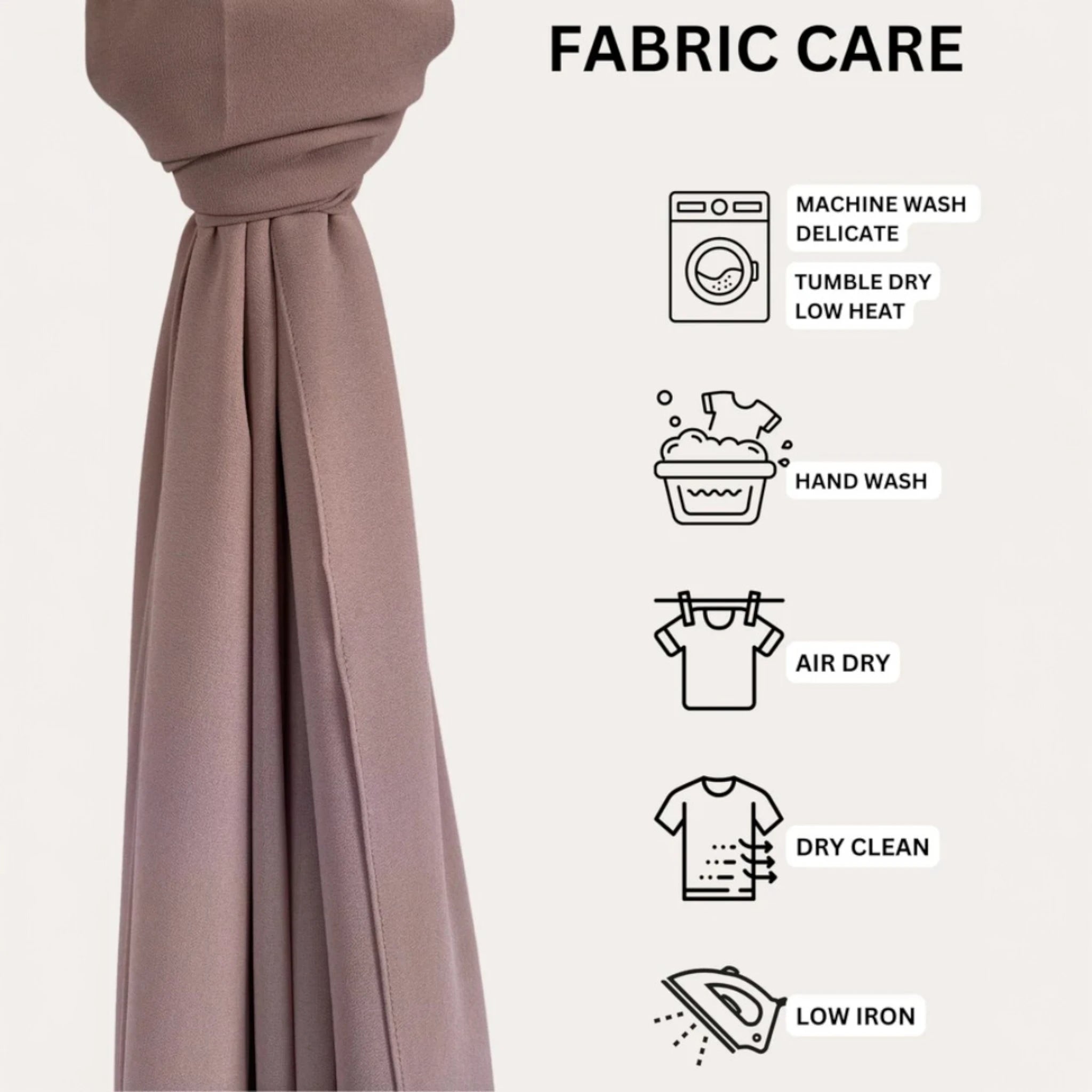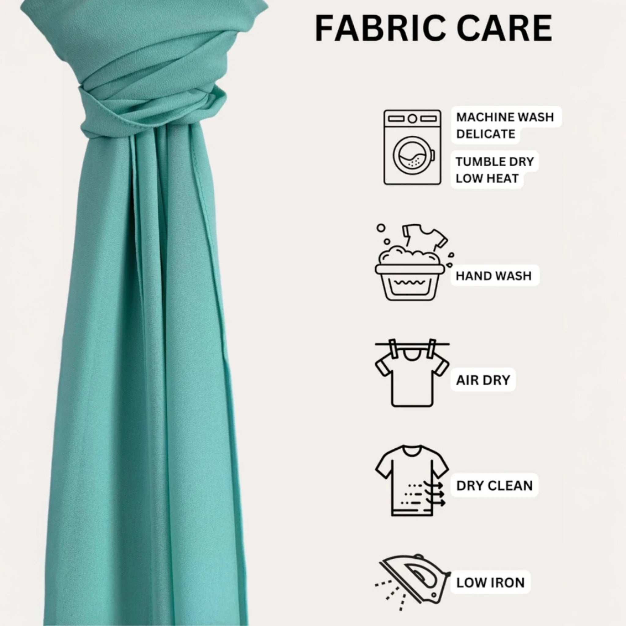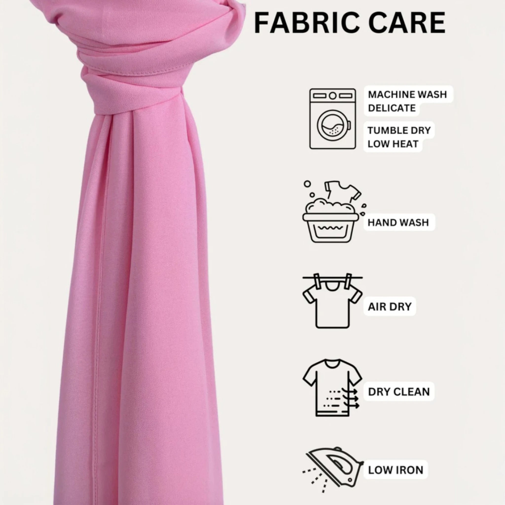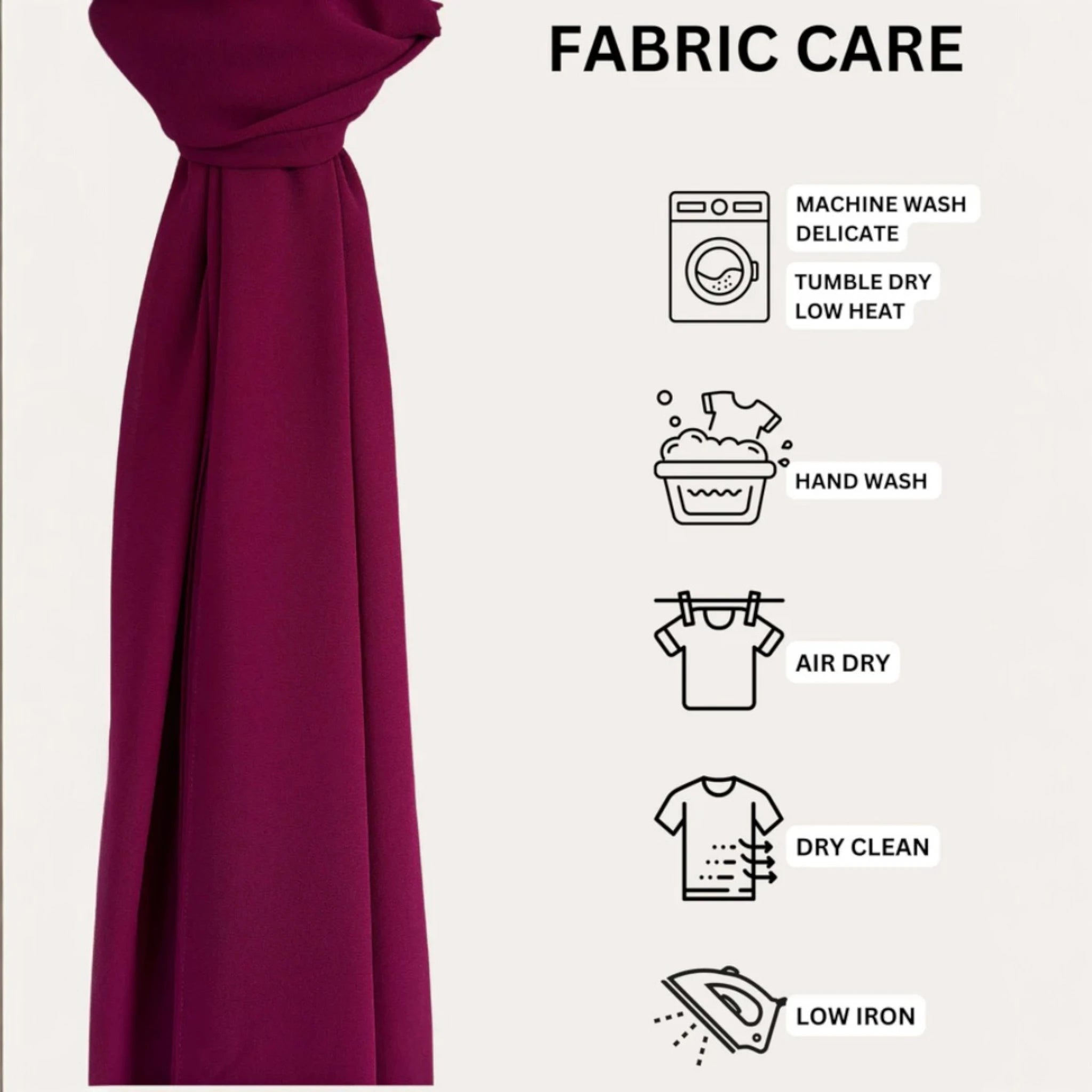 Hand wash/machine wash on delicate with a light detergent and in a cold water with only a like colors. Tumble dry on low or air dry, iron if needed. For stains use delicate fabric stain remover.