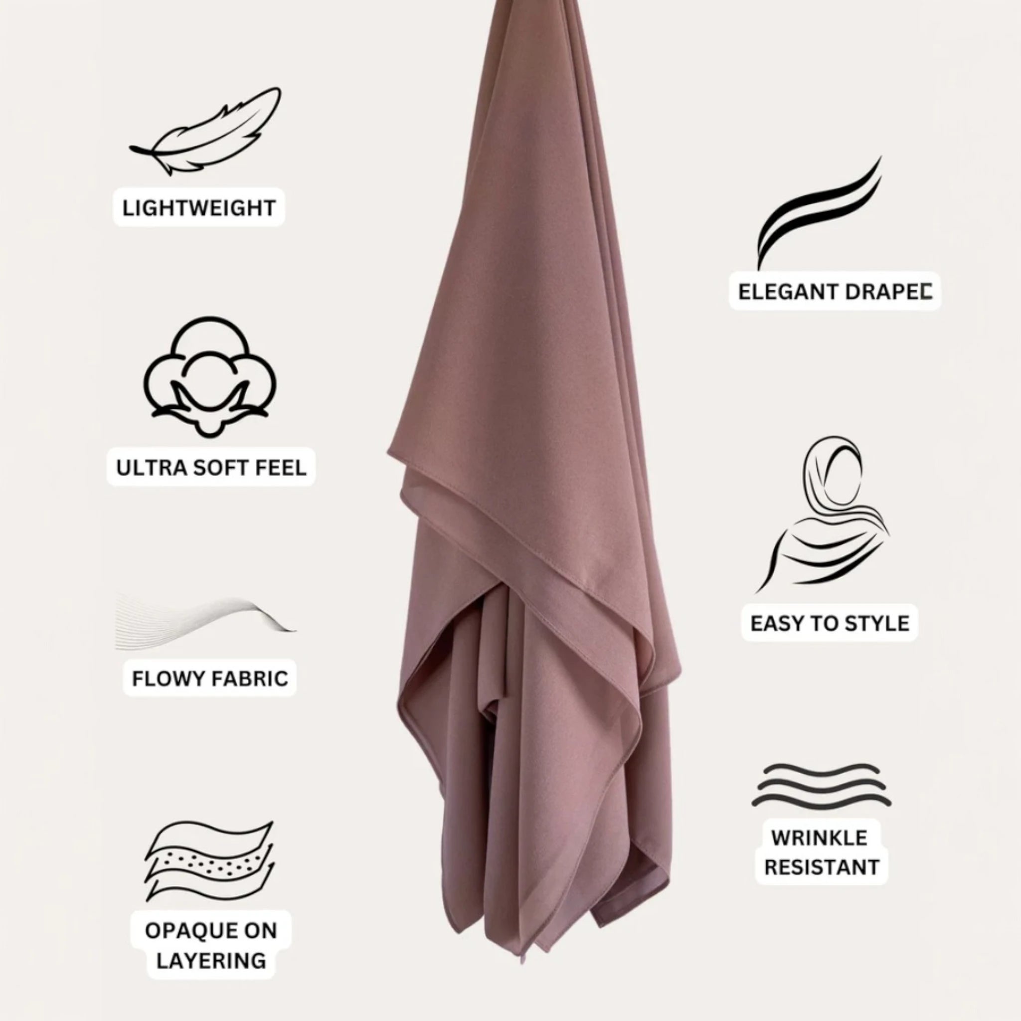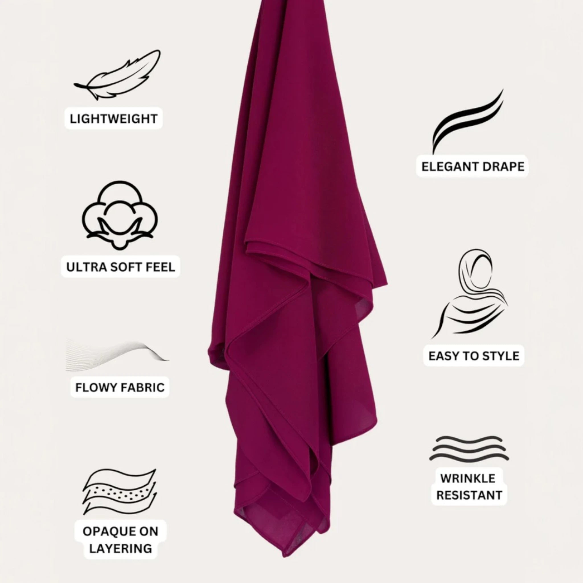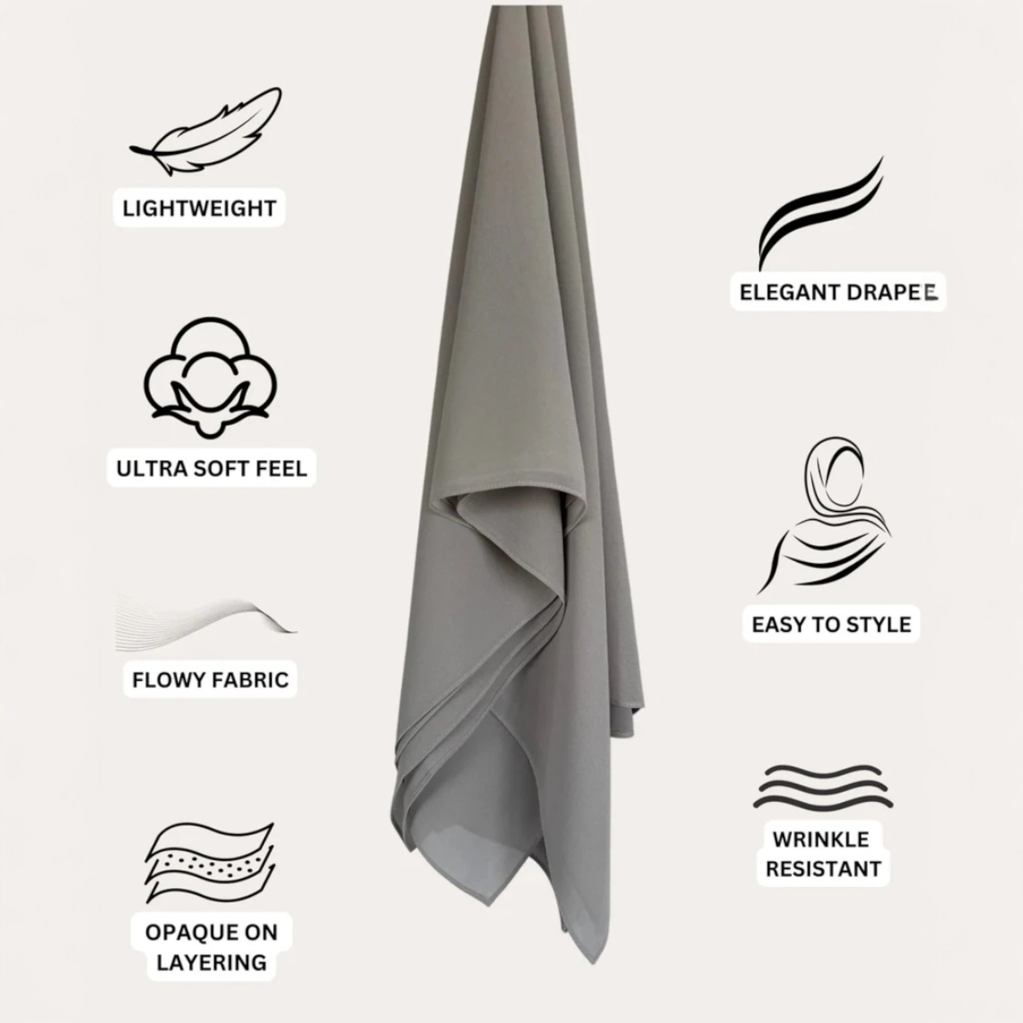 Featuring a soft, sheer texture with an opaque finish, these hijabs drape effortlessly while offering a slight stretch to complement your style. With ample length for versatile coverage and layering, they provide a secure, non-slip fit, making them the perfect choice for all-day comfort and sophistication.