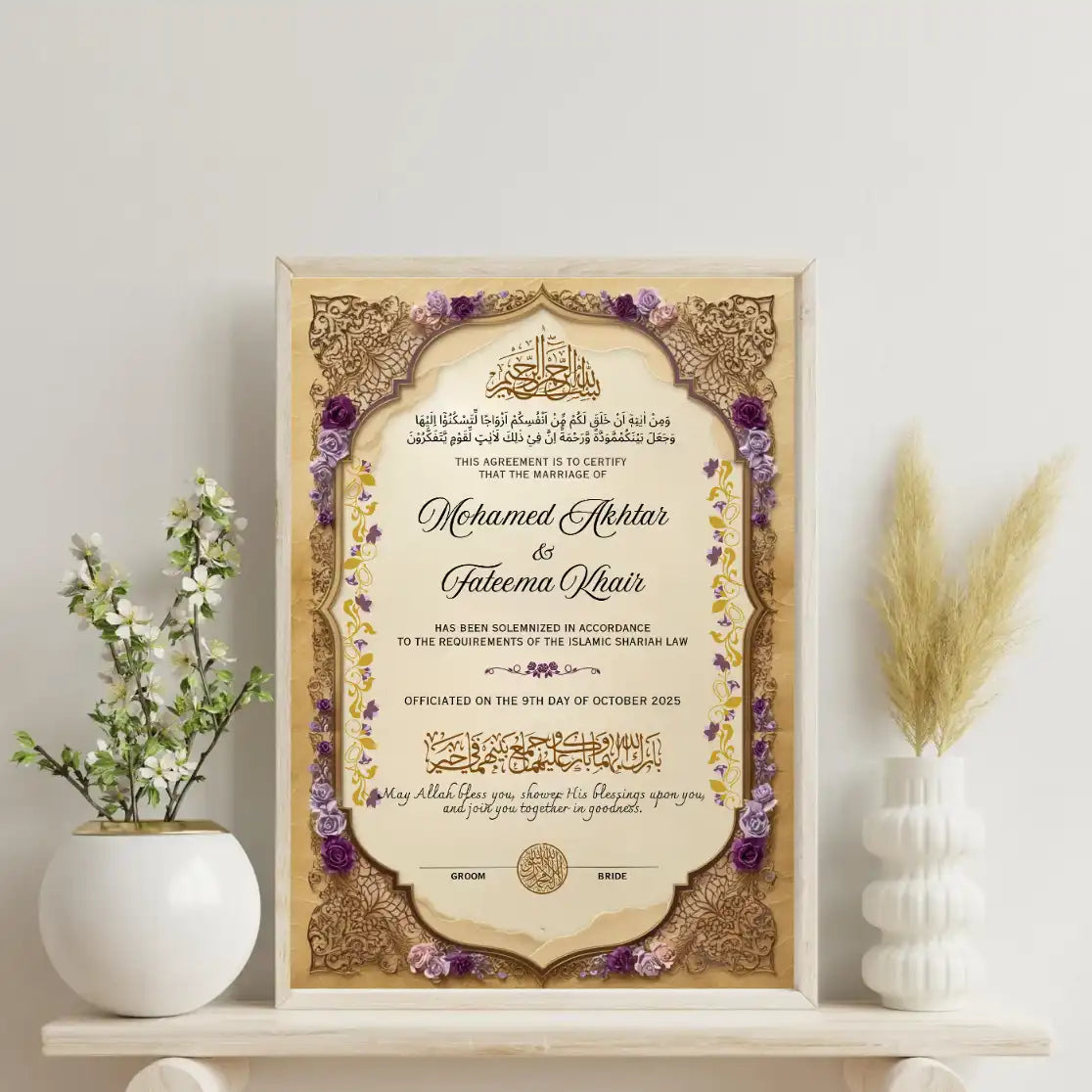 Passionate, timeless, and deeply meaningful — Qalb-e-Surkh captures the depth of love and sincerity shared in Nikah. Featuring rich maroon tones enhanced with golden embellishments, this exquisite frame embodies both devotion and spiritual elegance. The bold color palette signifies strength and loyalty, while delicate floral and geometric borders, inspired by Islamic artistry, add a touch of refinement.