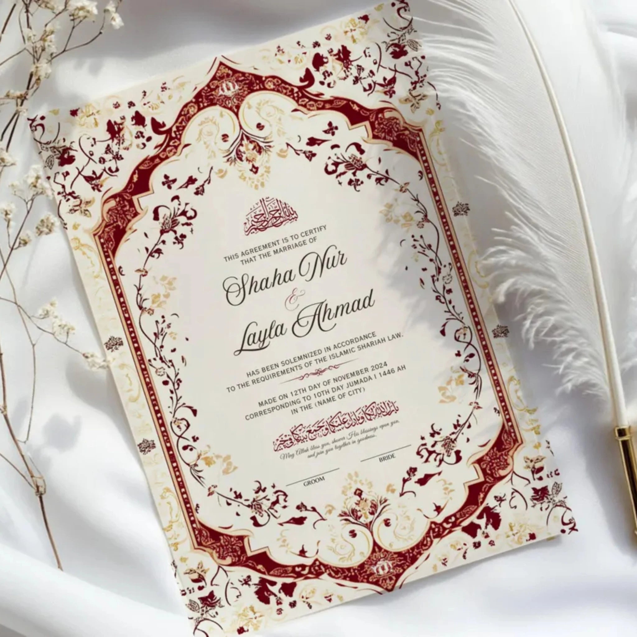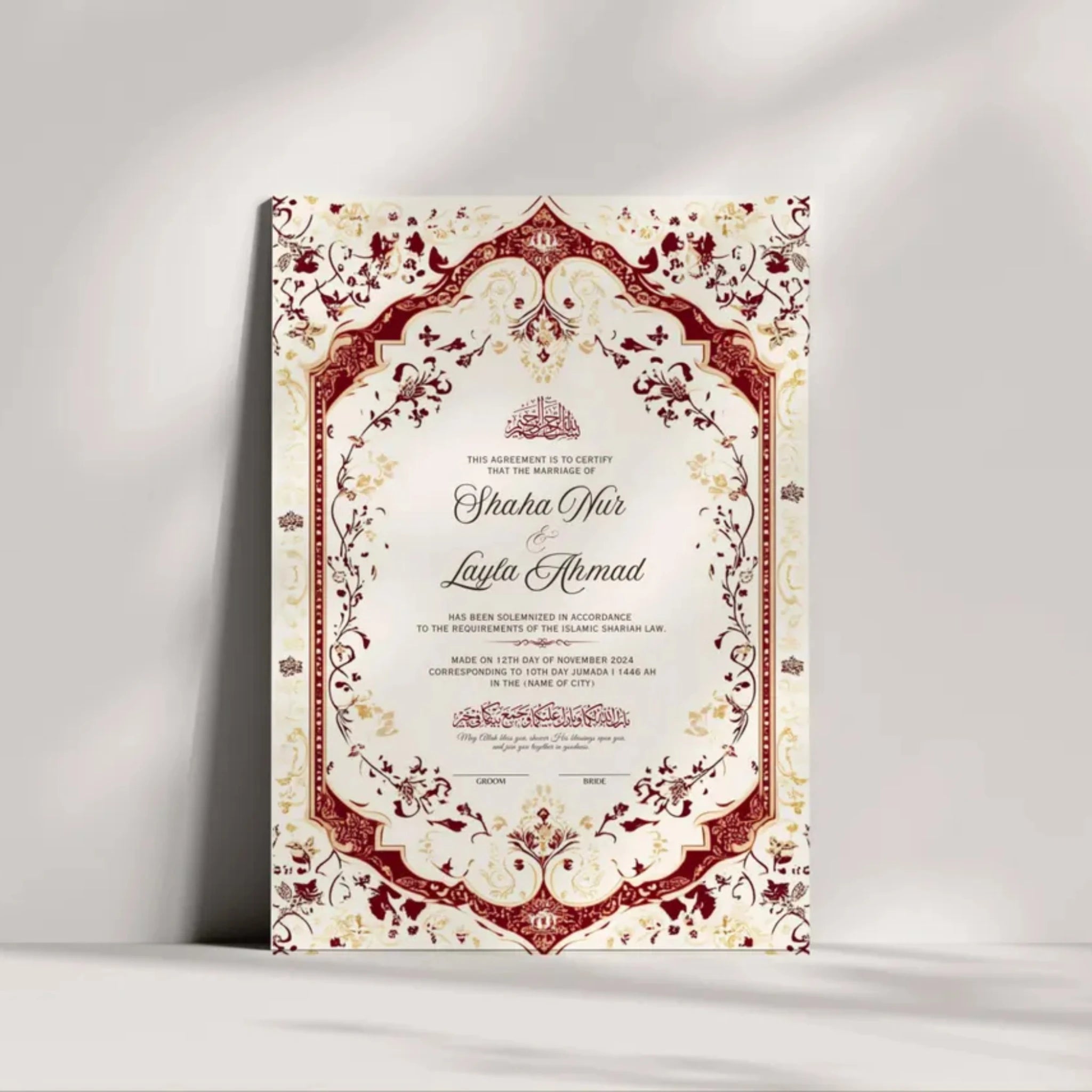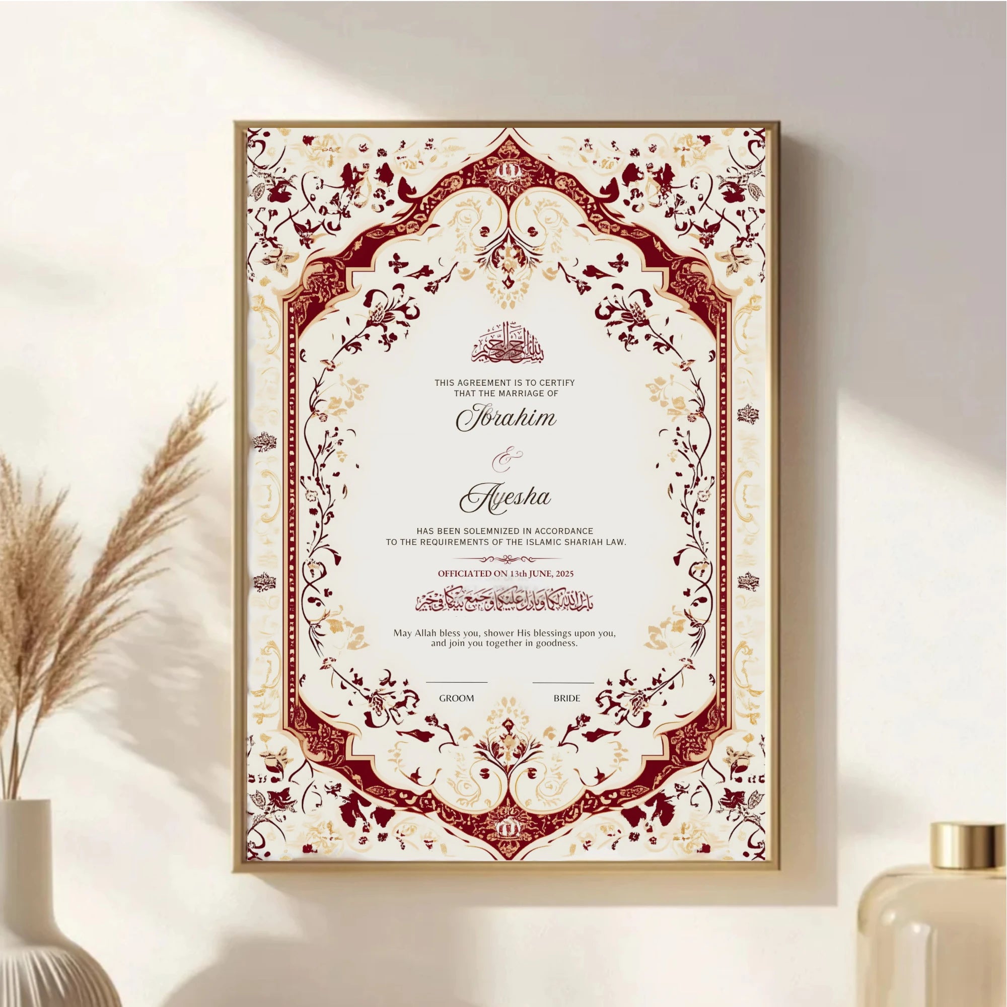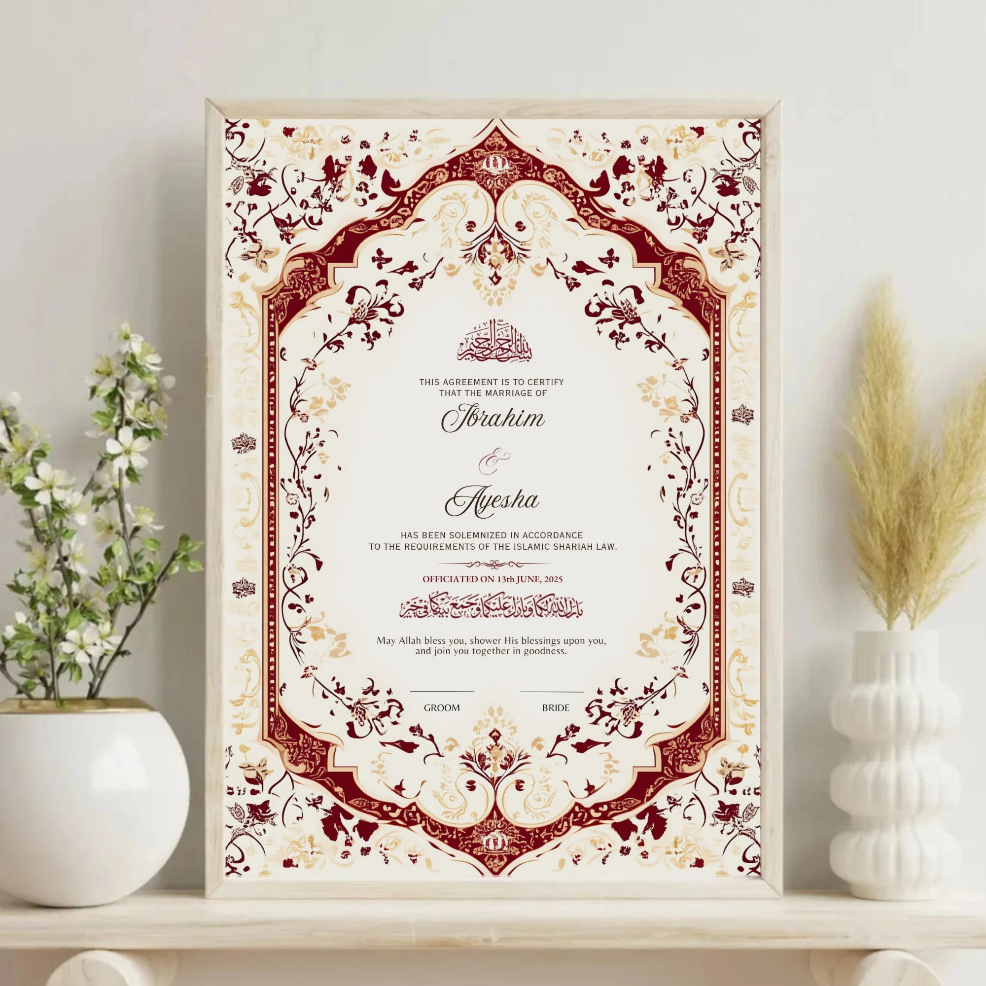 Celebrate the sacred bond of marriage with this beautifully crafted Nikah Nama Certificate encased in a premium wooden frame. A perfect Islamic wedding gift, this elegant keepsake symbolizes love, faith, and commitment.