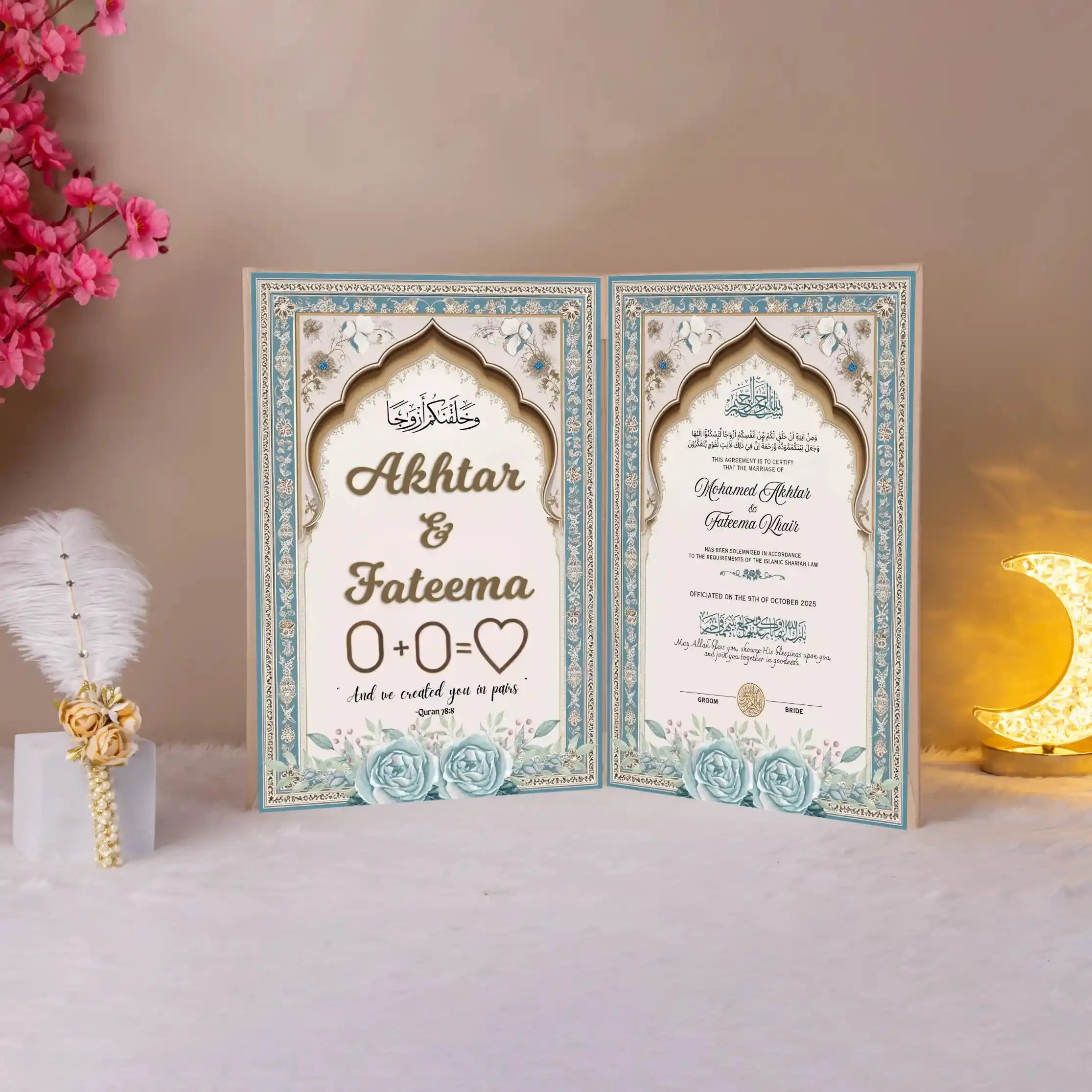 As part of Islamic Nikah gifting, this Nikah Nama makes a heartwarming choice for families looking to gift something memorable and meaningful to the bride and groom. Its fresh palette and spiritual undertones also make it an elegant keepsake to be framed and cherished for years to come.