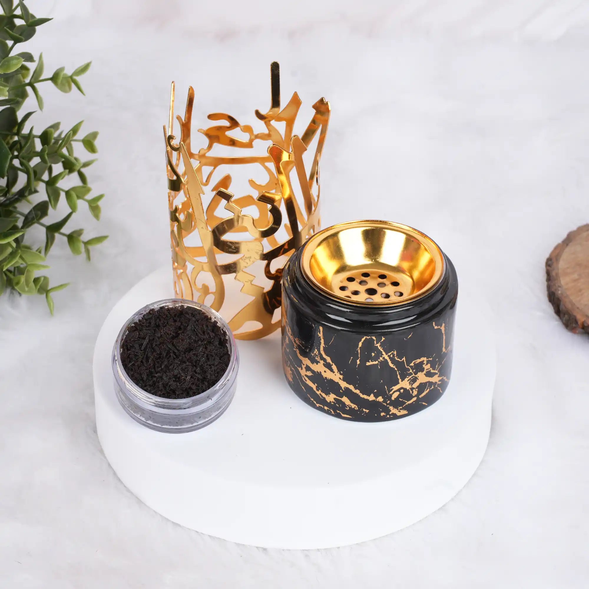 Add a touch of grace and fragrance to your space with the Sultan Noir Bakhoor Burner. Crafted in a soft blush ceramic finish and crowned with a royal gold lid, this self-burning burner gently releases the rich aroma of bakhoor and oud, creating a warm and serene ambience.