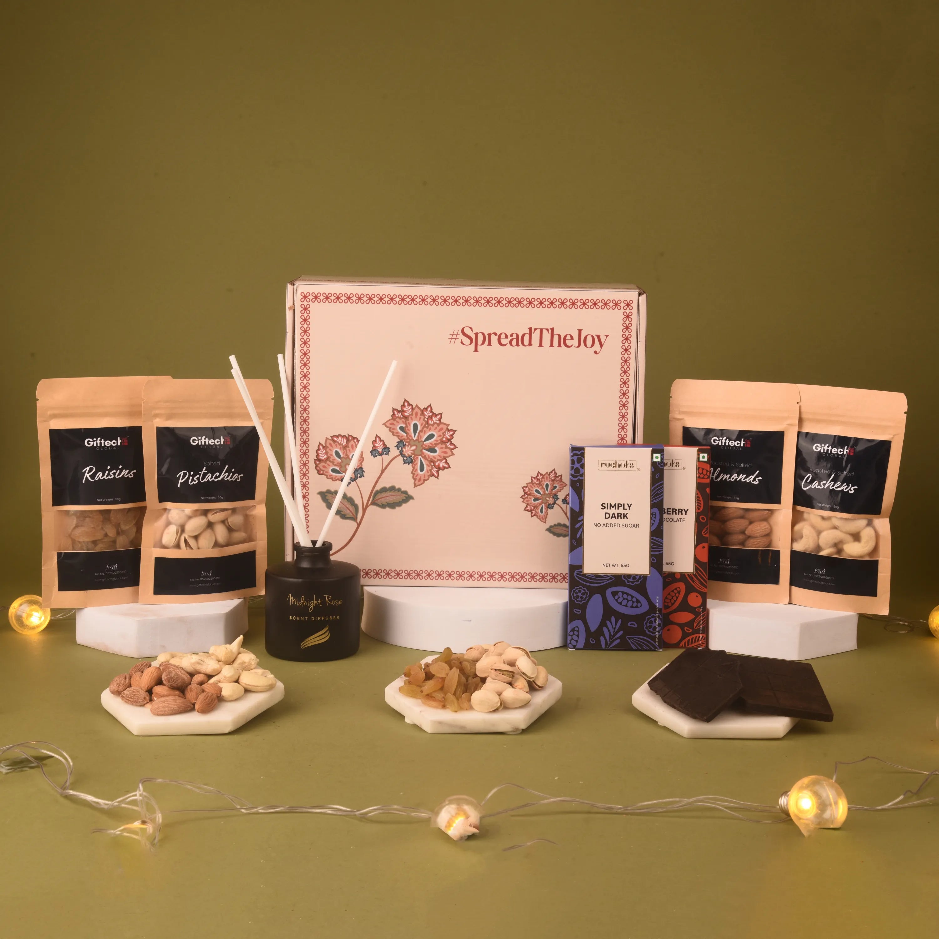 The Sukoon Gift Box is a sophisticated blend of flavors and aromas, thoughtfully designed to elevate the joy of Islamic celebrations. It beautifully combines the timeless richness of dry fruits and chocolates with the soothing charm of a rose aroma diffuser, creating a gift that delights every sense.