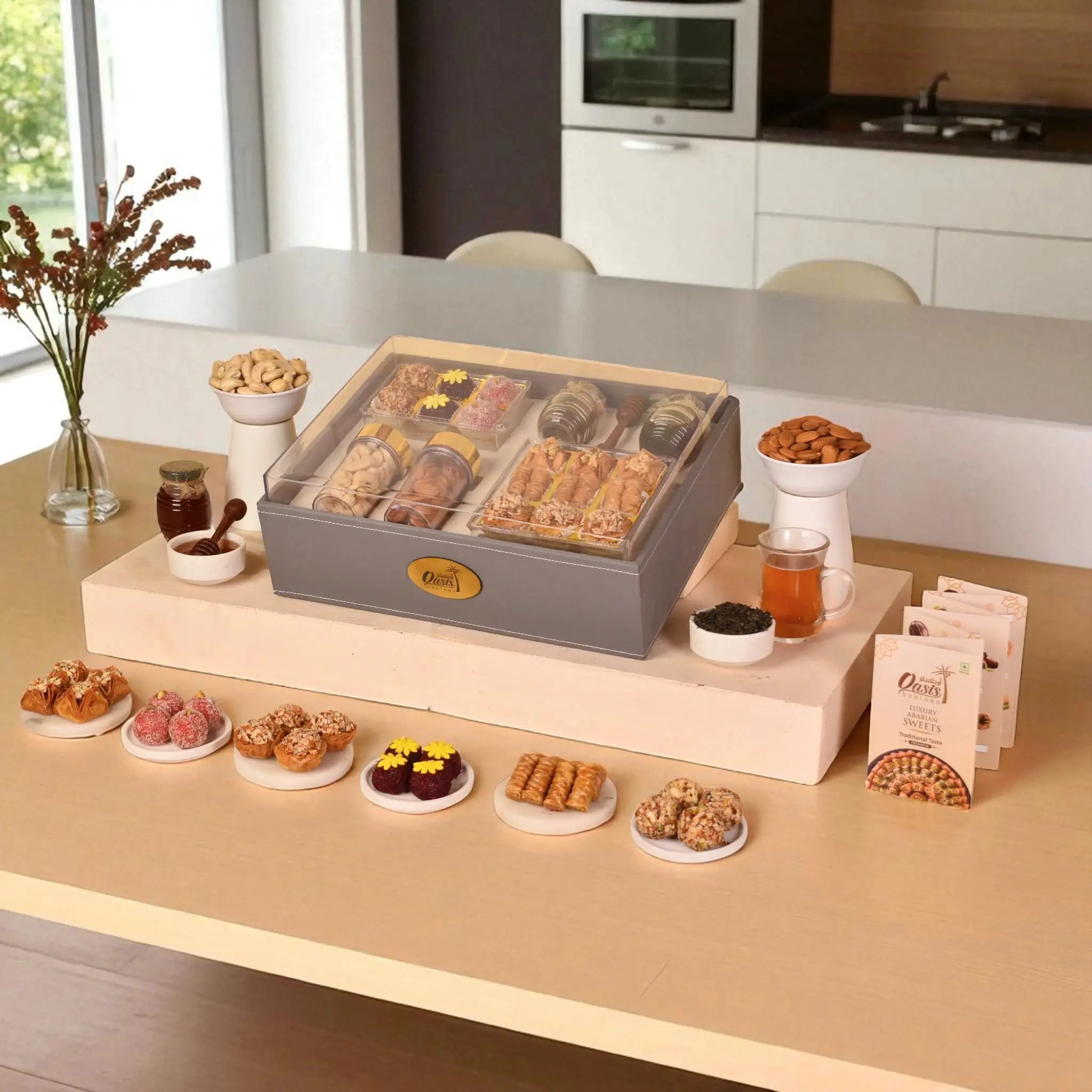 An elegant festive sweets hamper combining the goodness of plain cashews and almonds with a premium tea jar for a refined touch. Paired with delicious fusion balls and a jar of premium baklawa, this gourmet hamper is perfect for gifting, offering a balance of rich flavors and premium quality for special occasions.
