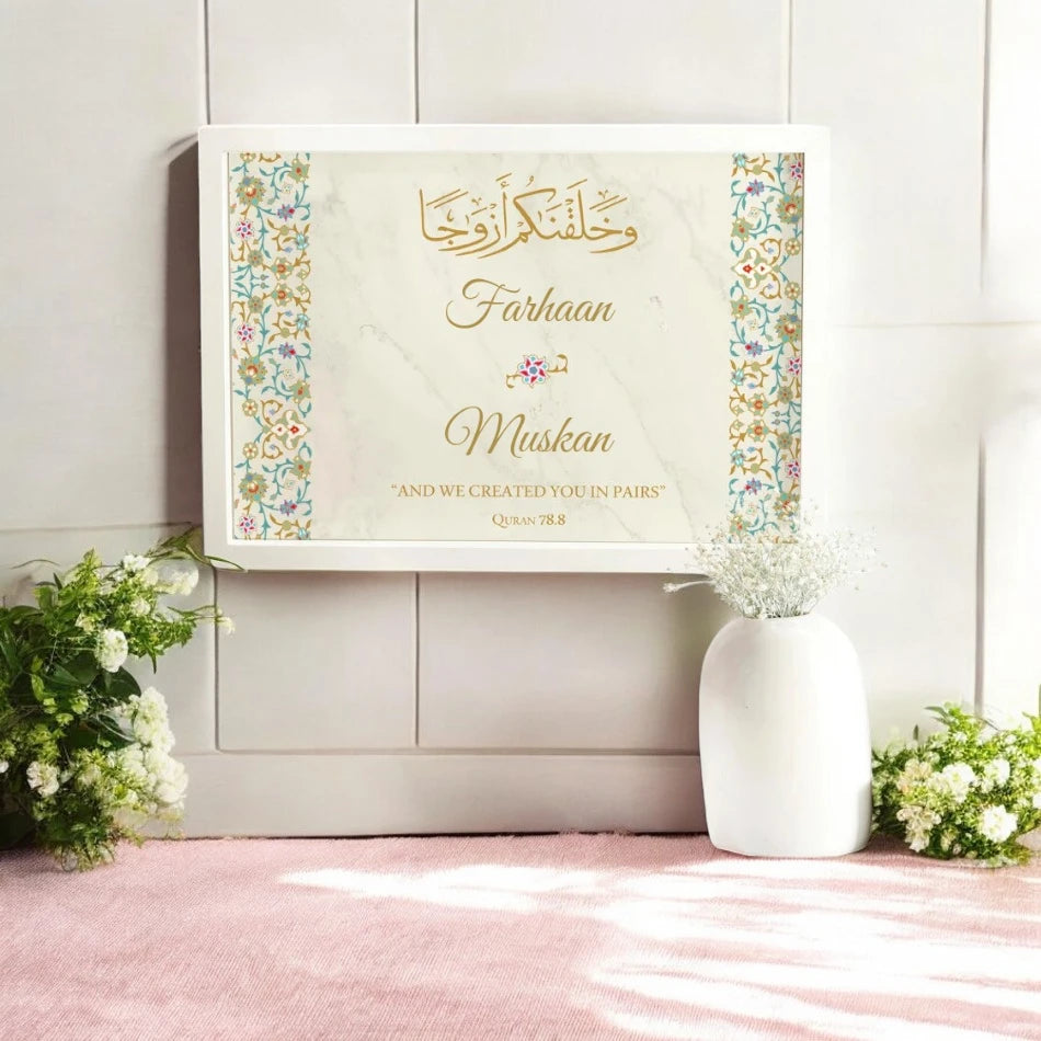 Celebrate the beauty of companionship with the And We Created You In Pairs Personalized Wooden Frame. Featuring a thoughtful Islamic quote, this frame beautifully captures the essence of unity and partnership. Crafted from high-quality wood, it can be personalized with names or a special date, making it an ideal gift for weddings, anniversaries, or any meaningful occasion.