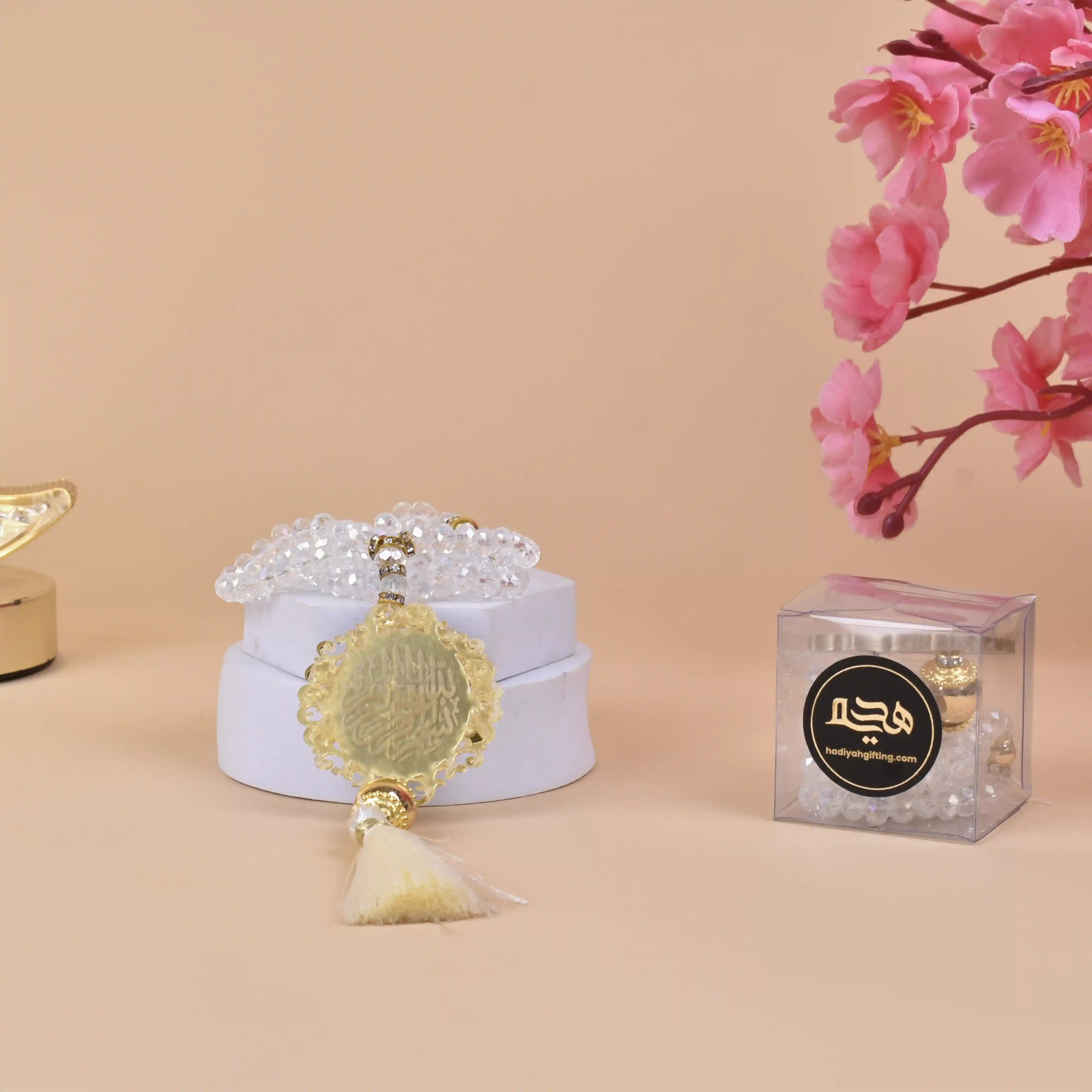 White Crystal Tasbeeh with Bismillah (100 Beads)